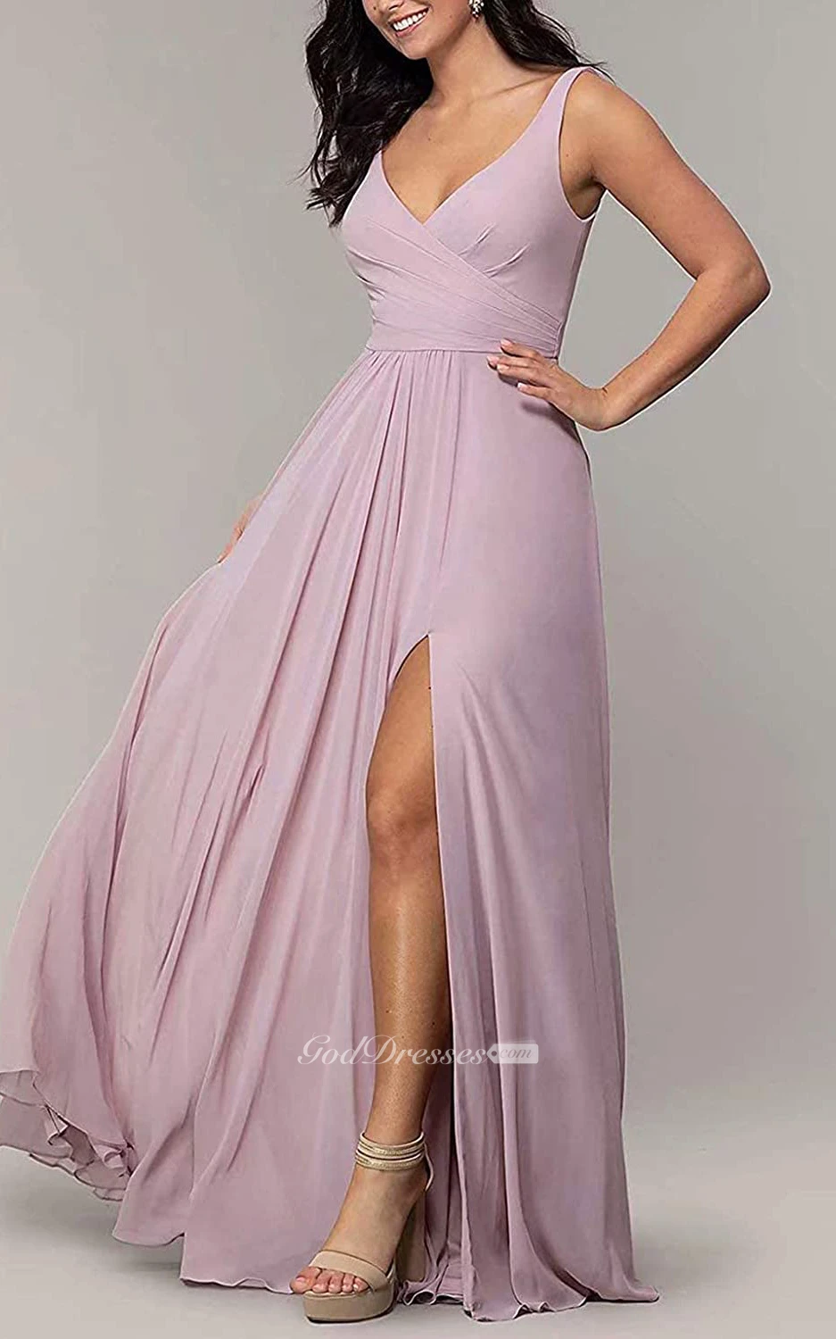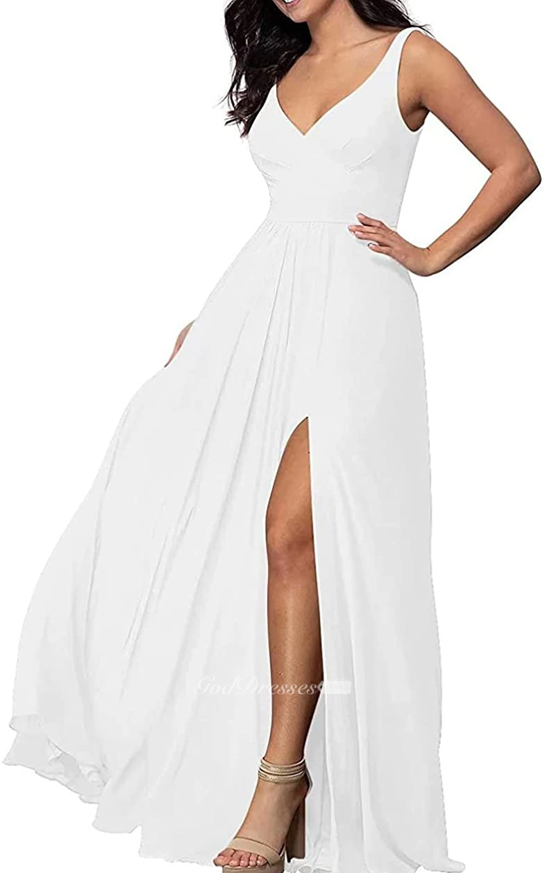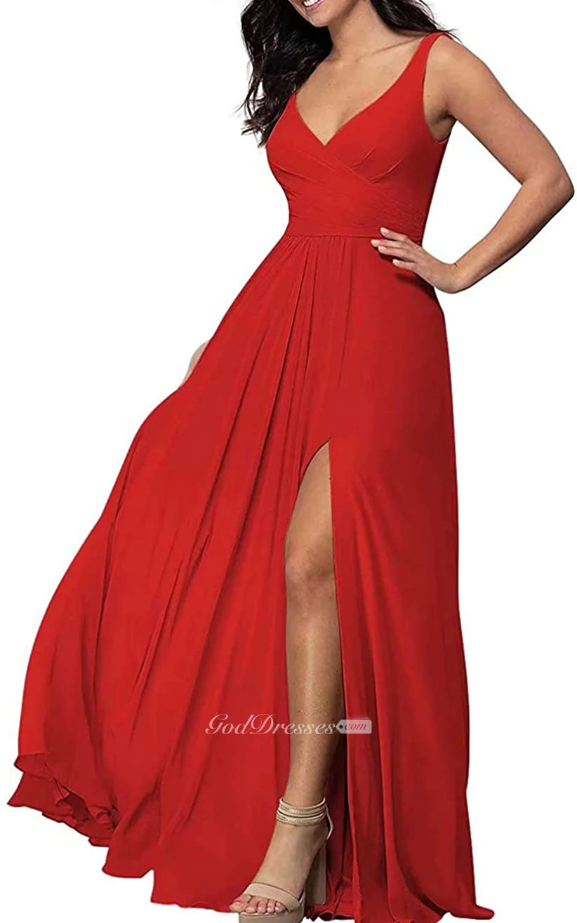V-neck A Line Sleeveless Floor-length Chiffon Bridesmaid Dress With Split Front