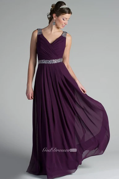 V Neck Back Dropping Chiffon Long Bridesmaid Dress With Crystal Straps And Waist