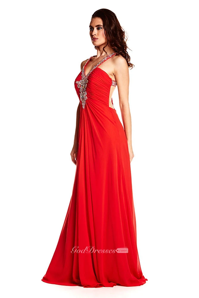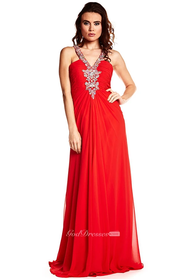V-Neck Beaded Sleeveless Chiffon Prom Dress With Ruching And Straps
