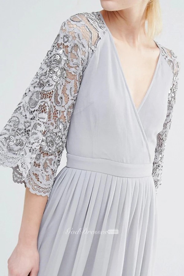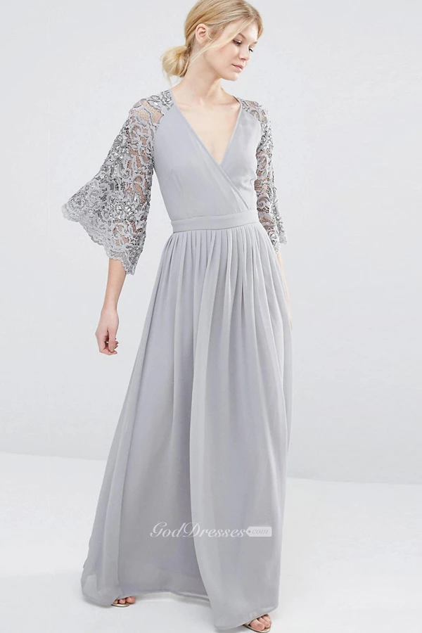 V-Neck Bell Sleeve Lace Chiffon Bridesmaid Dress With Pleats