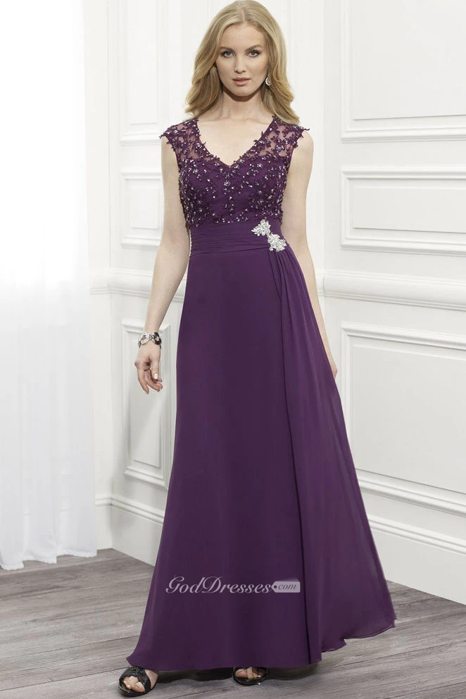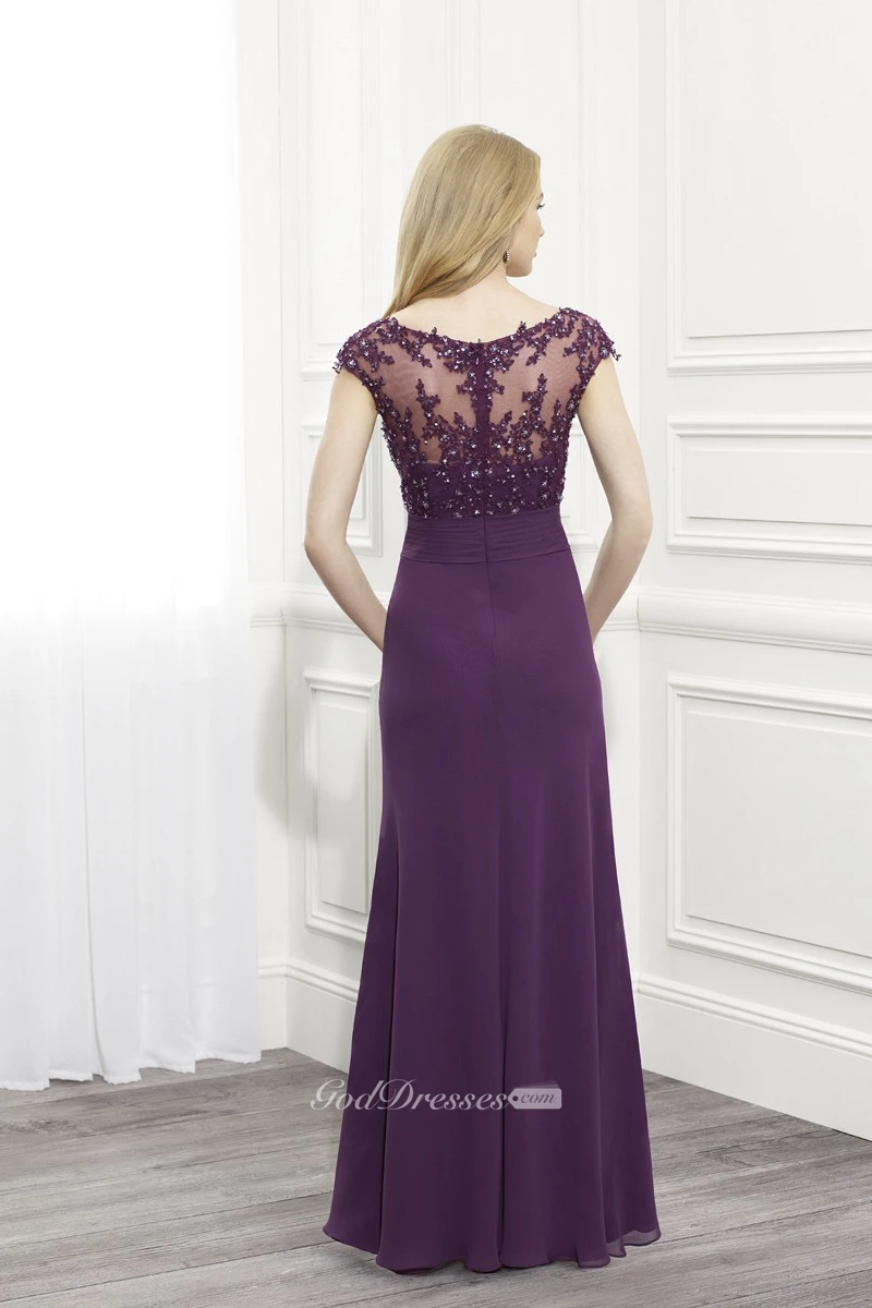 V-Neck Cap Sleeve Chiffon Formal Dress With Beading And Illusion Back