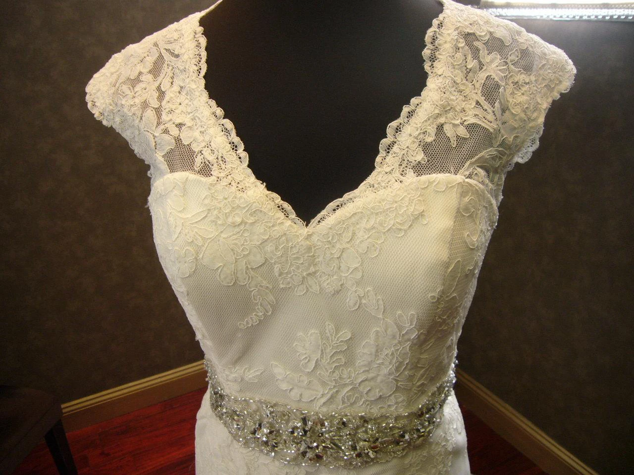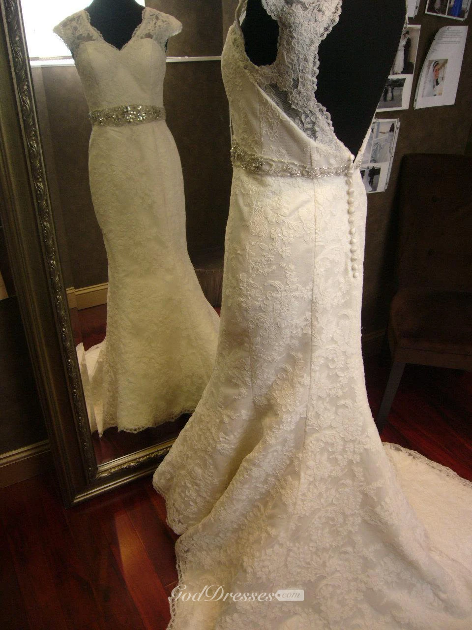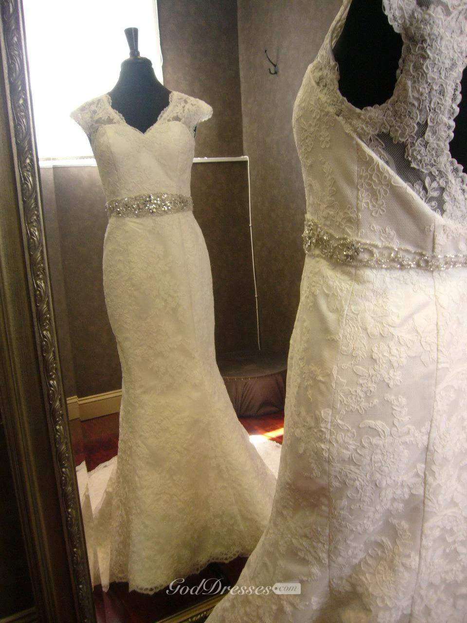 V-Neck Cap Sleeve Mermaid Lace Dress With Keyhole Back and Beaded Sash