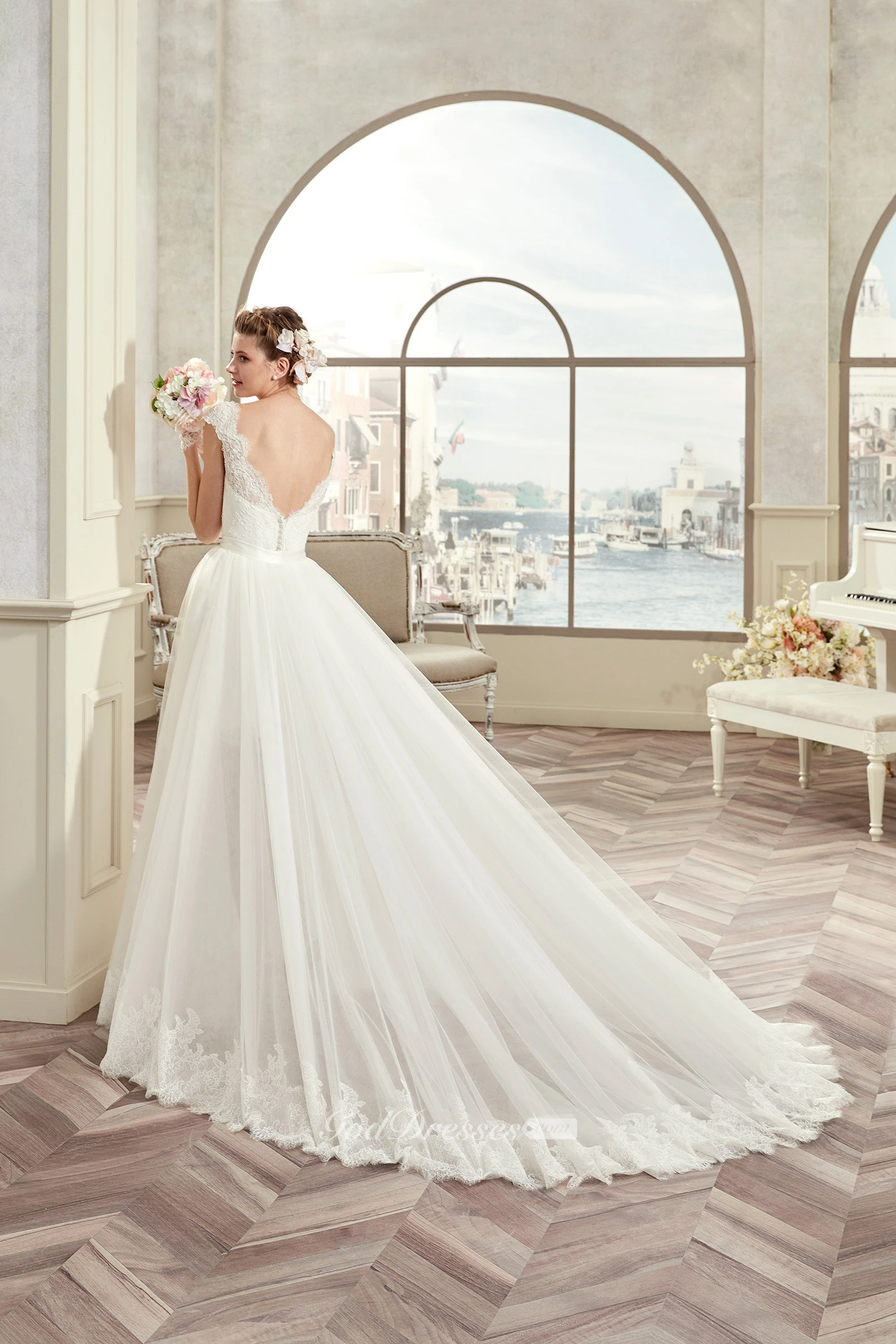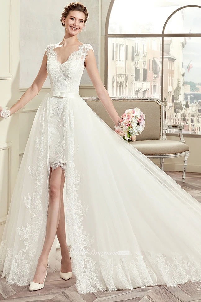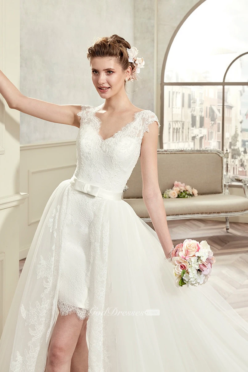 V-Neck Cap-Sleeve Short Lace Wedding Dress With Detachable Overlayer And Open Back