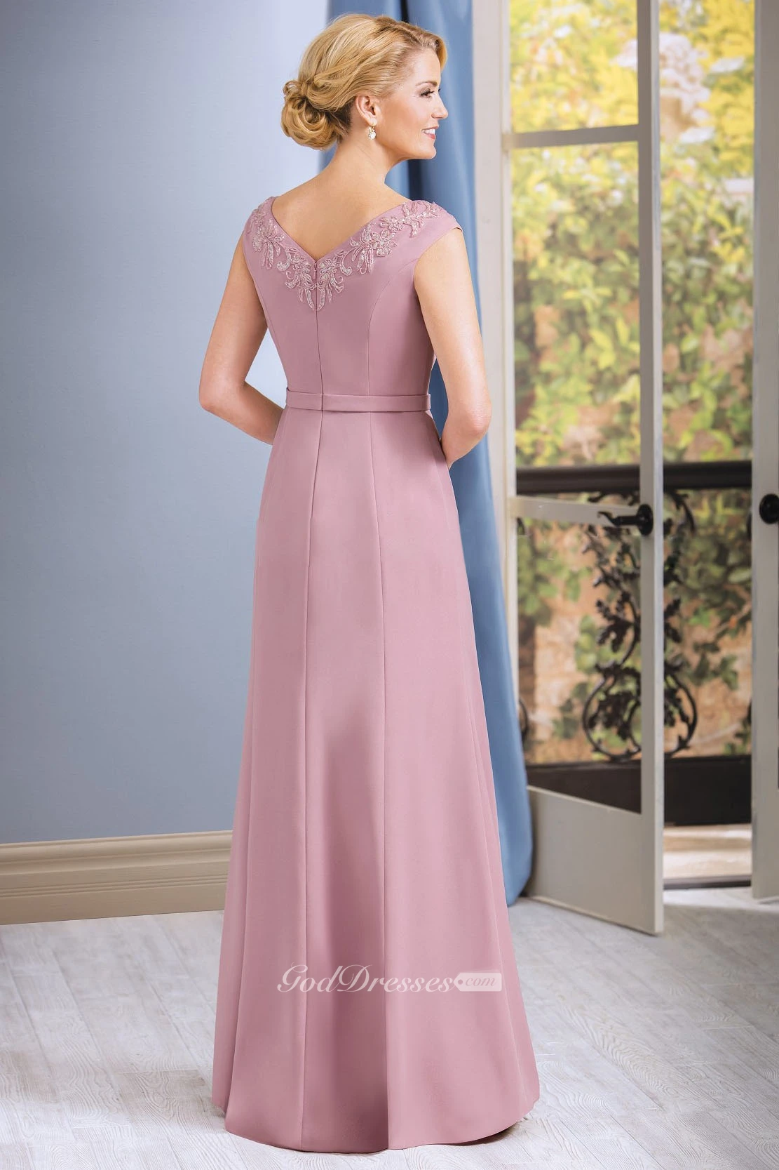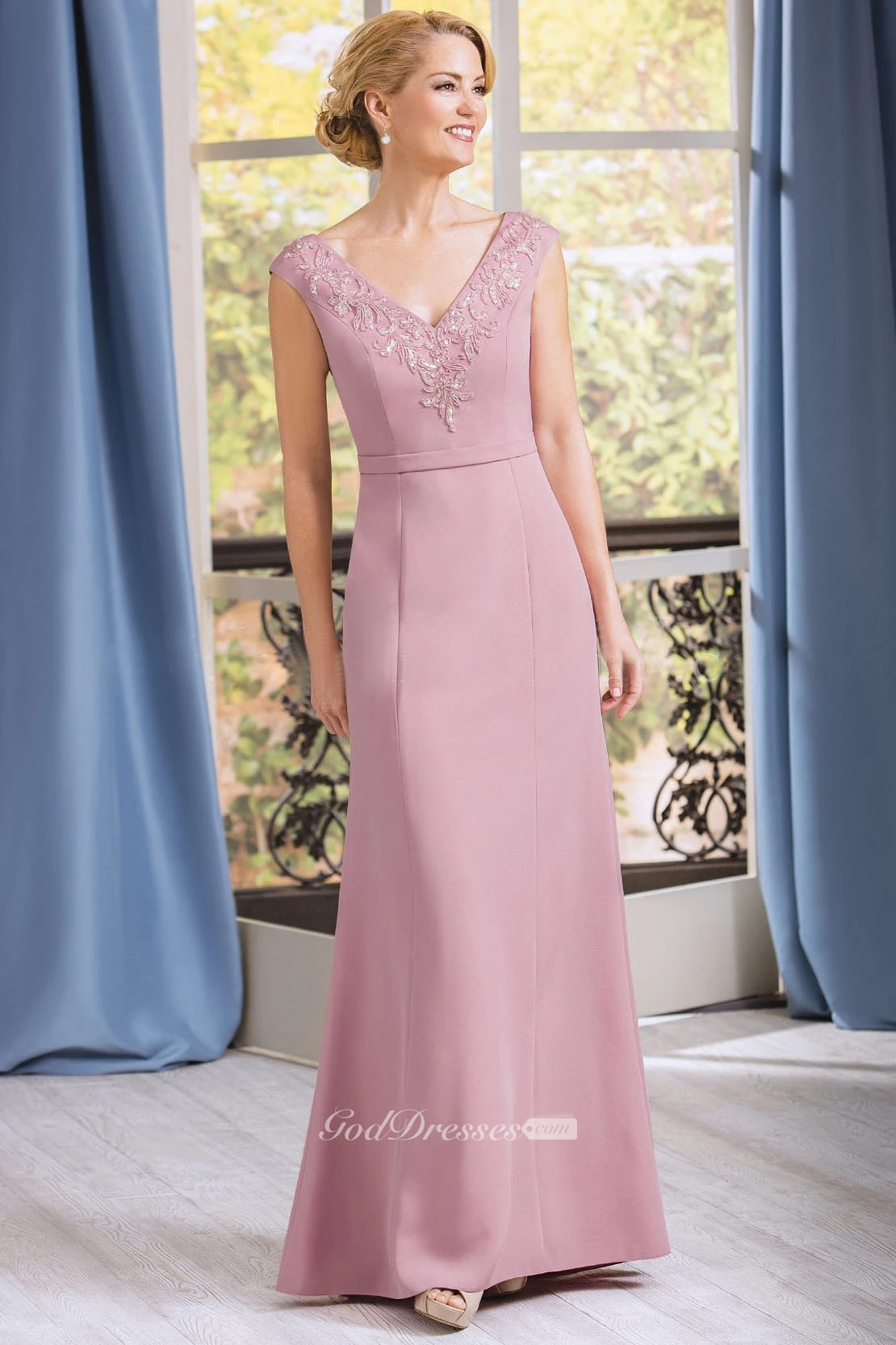V-Neck Cap-Sleeved Long Mother Of The Bride Dress With Appliques And Jewels