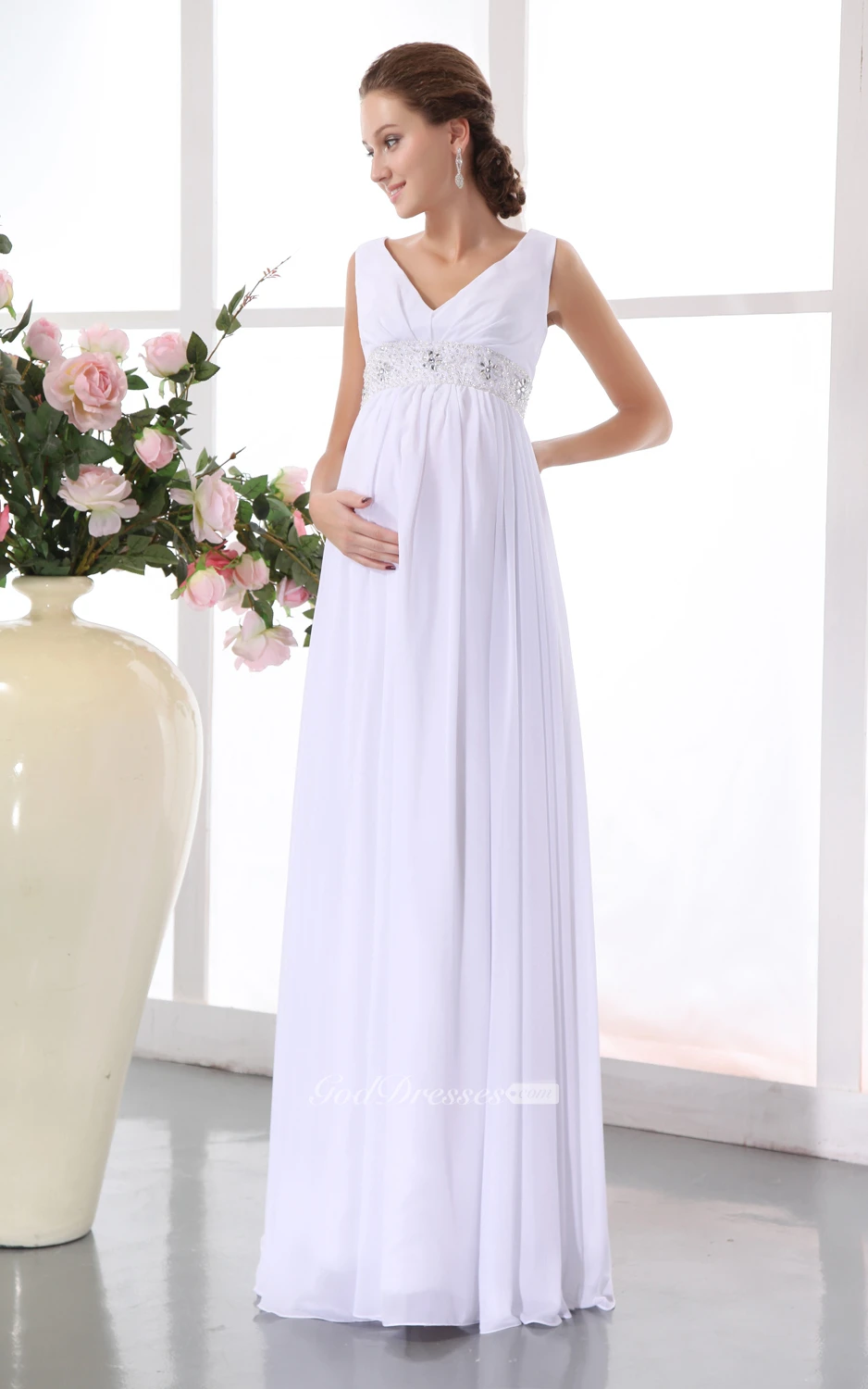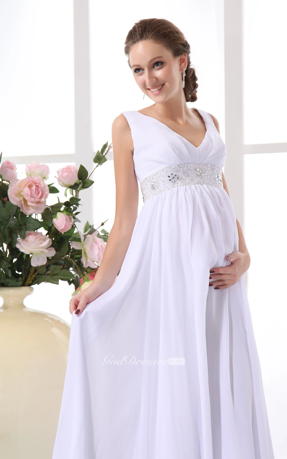 V-Neck Chiffon Maternity Dress With Pleating and Belted Waistband