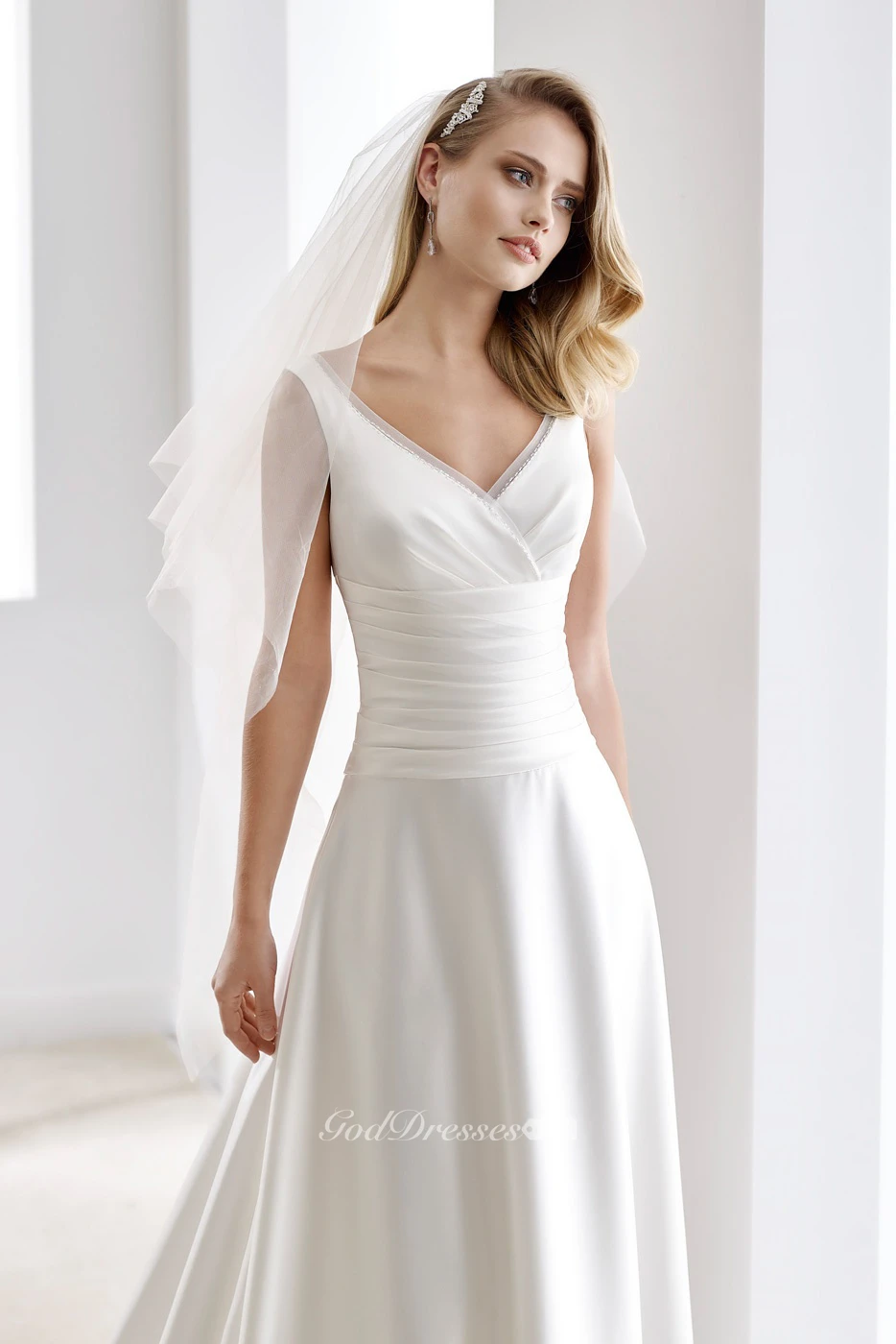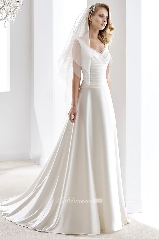 V-Neck Draping Satin Wedding Dress With Pleated Bodice And Brush Train