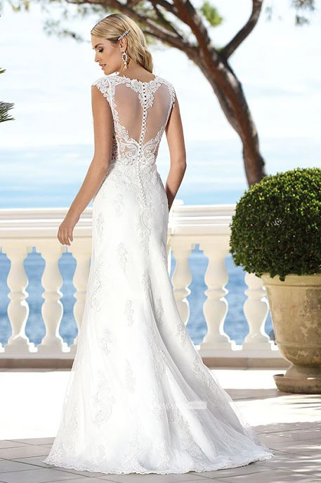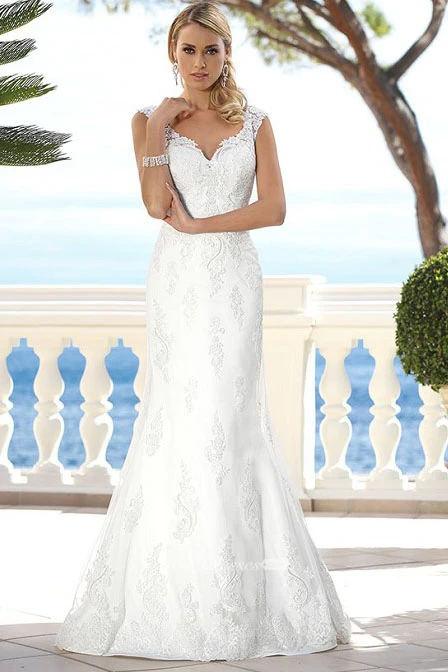 V-Neck Floor-Length Appliqued Lace Wedding Dress With Brush Train And Illusion
