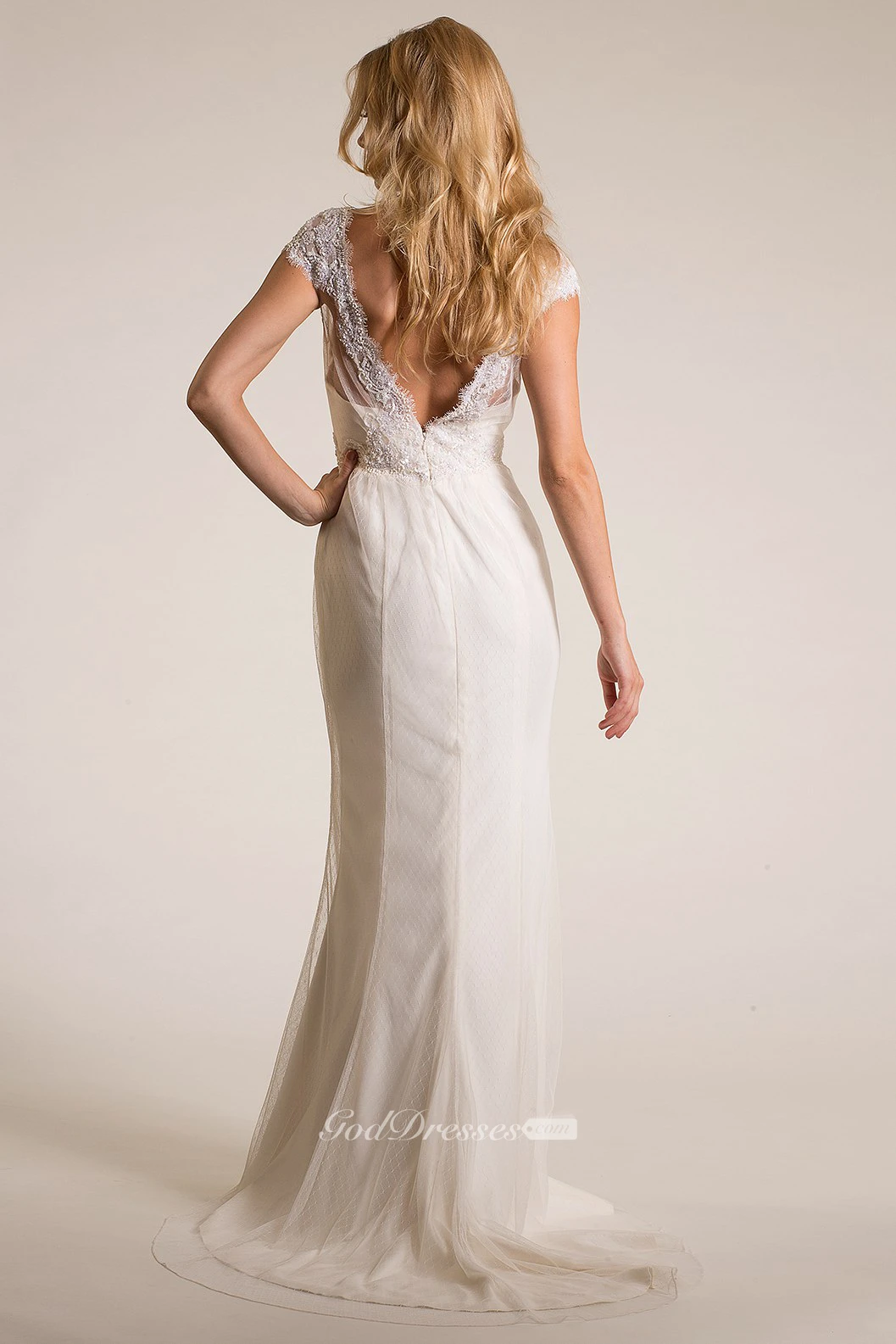 V-Neck Floor-Length Cap-Sleeve Appliqued Chiffon Wedding Dress