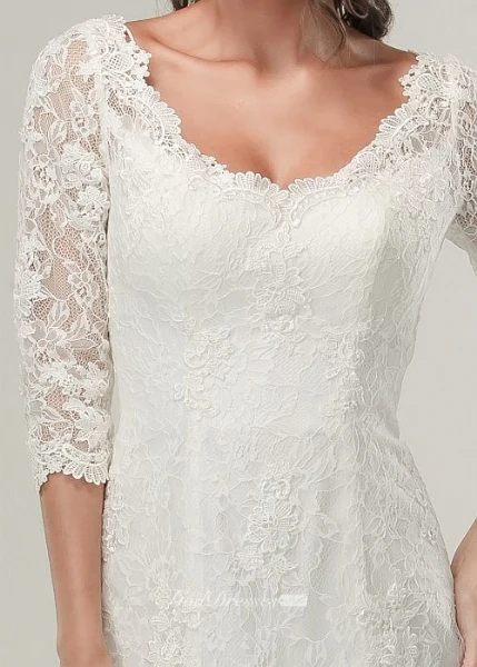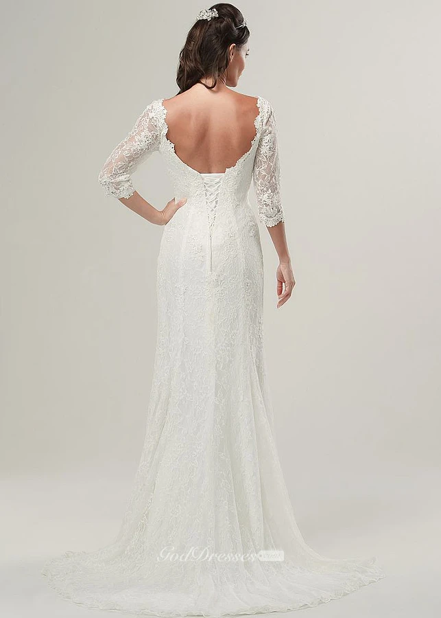 V-Neck Floor-Length Half Sleeve Lace Wedding Dress With Brush Train And Lace Up