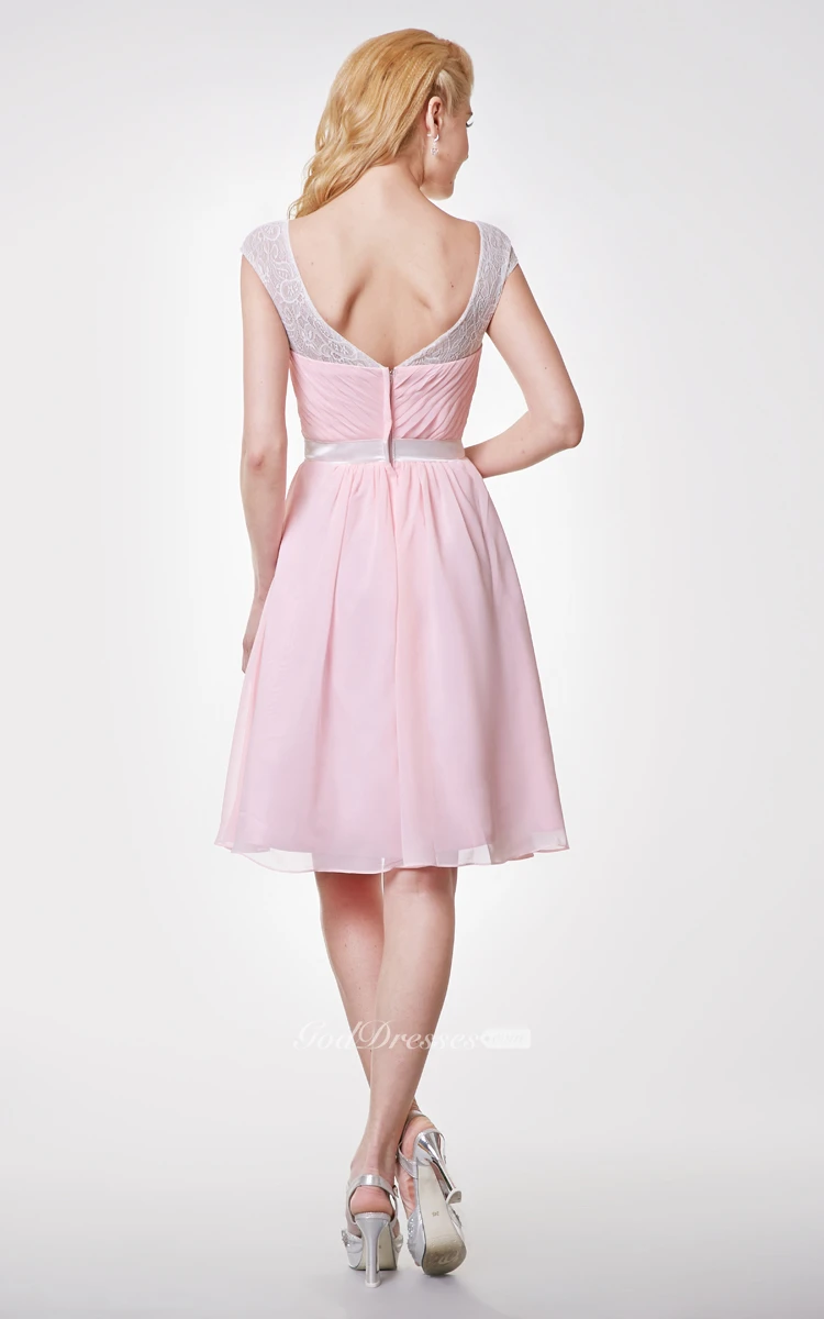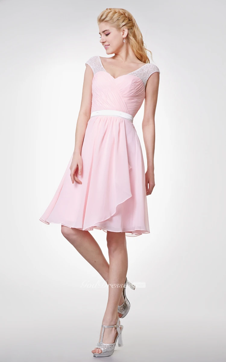 Your bridal party will look truly elegant in this beautiful v-neck knee-length chiffon side drape bridesmaid dress with a sash. A modern sweetheart style neckline is accented by illusion straps, creating a flattering v-neckline with cap sleeves. Delicate ruching decorates the bodice of the gown and is complemented perfectly with a fitted sash at the waist. Flowing side draping completes the look for an elegant appearance that’s perfect for any bridal party.