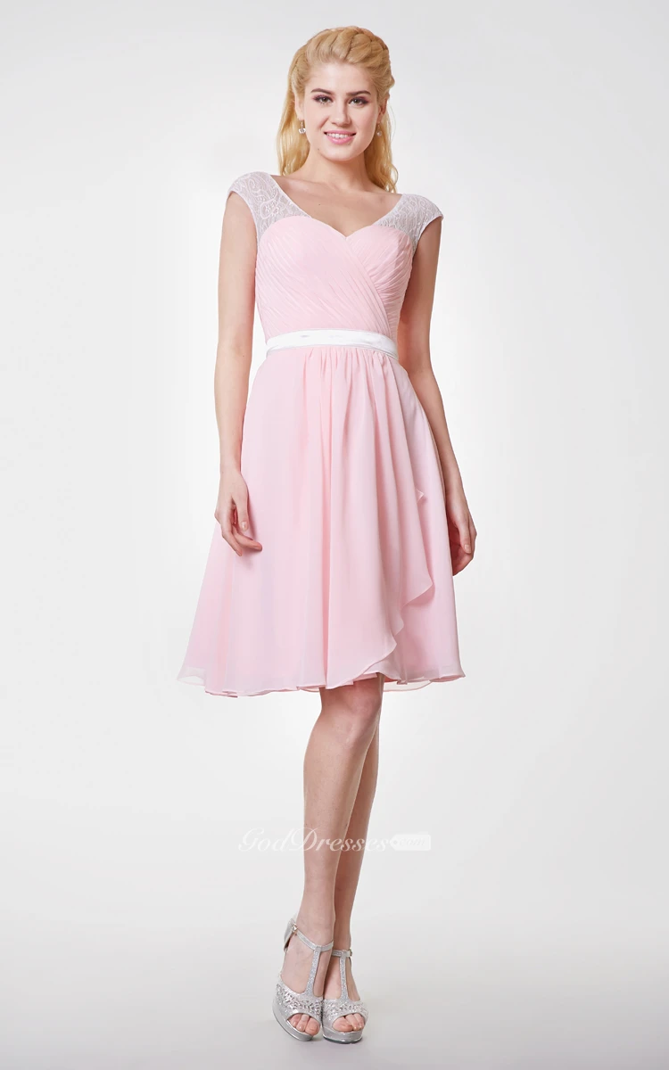 V-neck Knee Length Chiffon Side-draped Dress With Sash