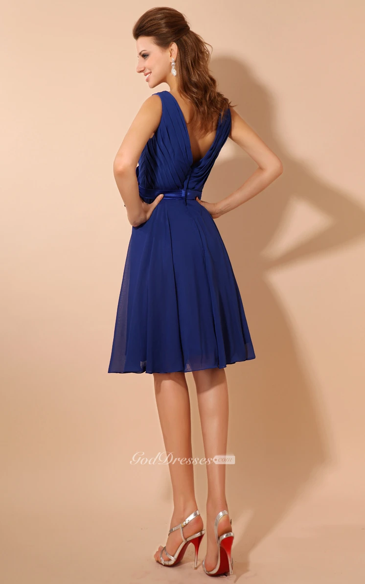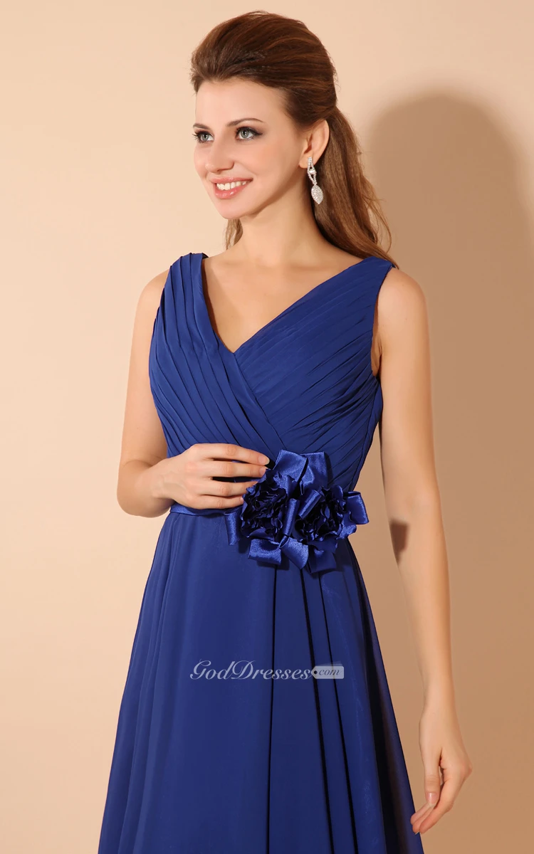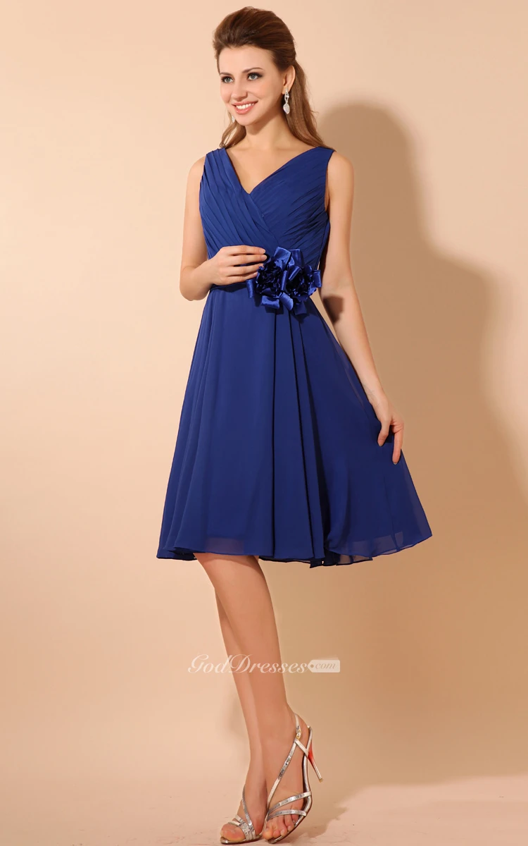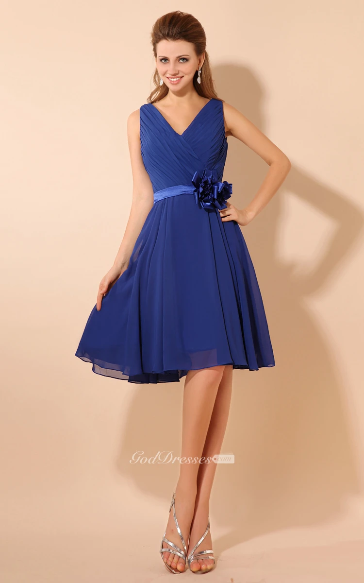 V-Neck Knee-Length Dress With Ruching and Flower