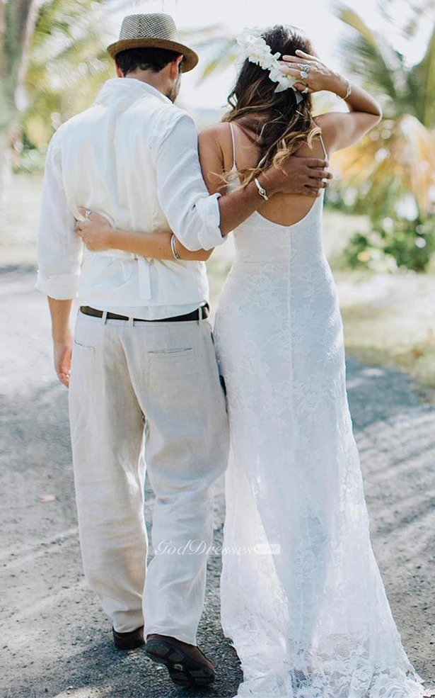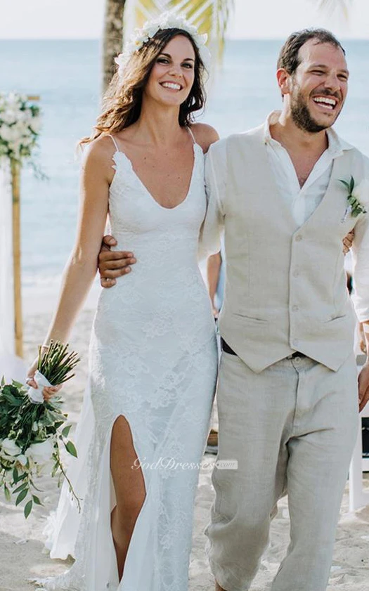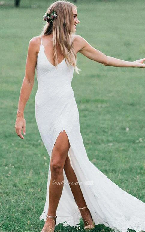 V-neck Lace Sheath Floor-length Sweep Train Sleeveless Wedding Dress with Split Front