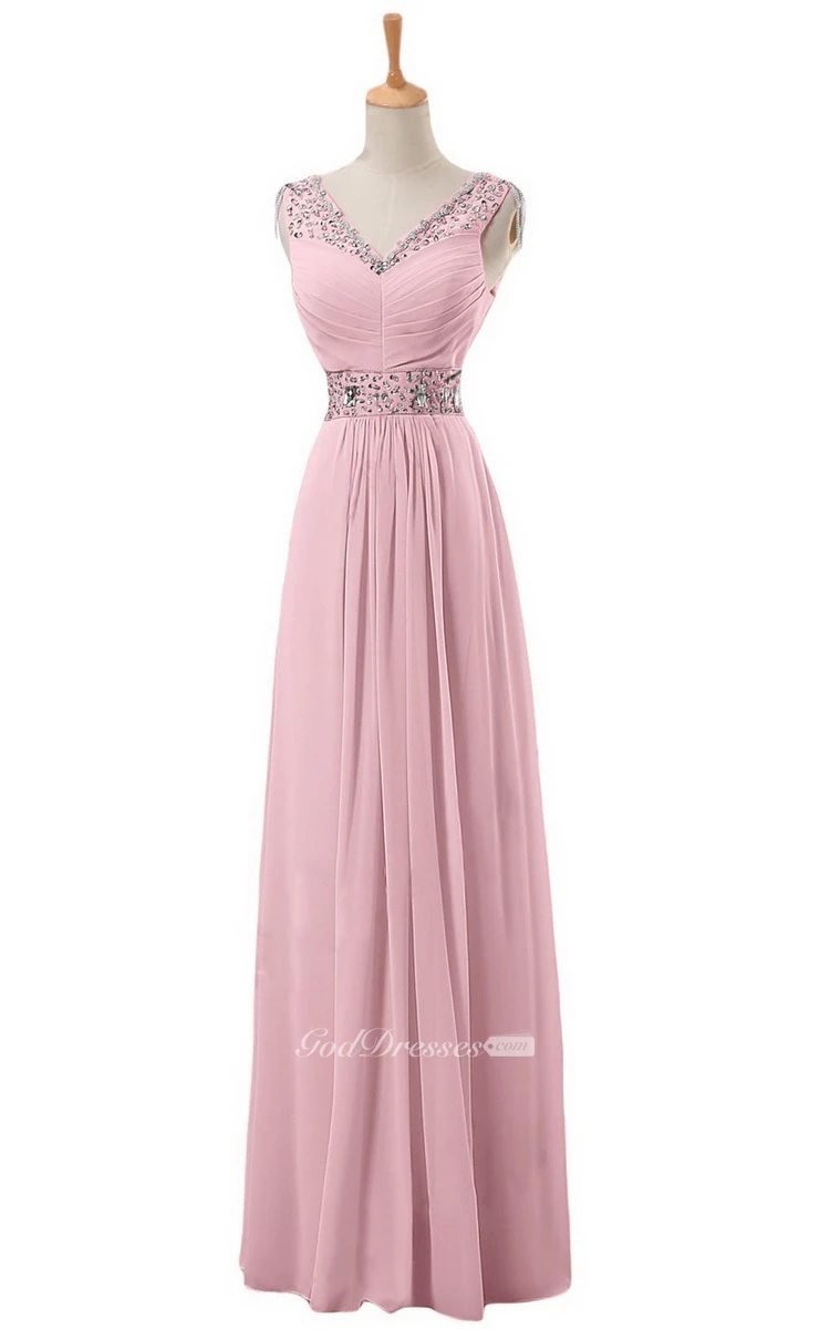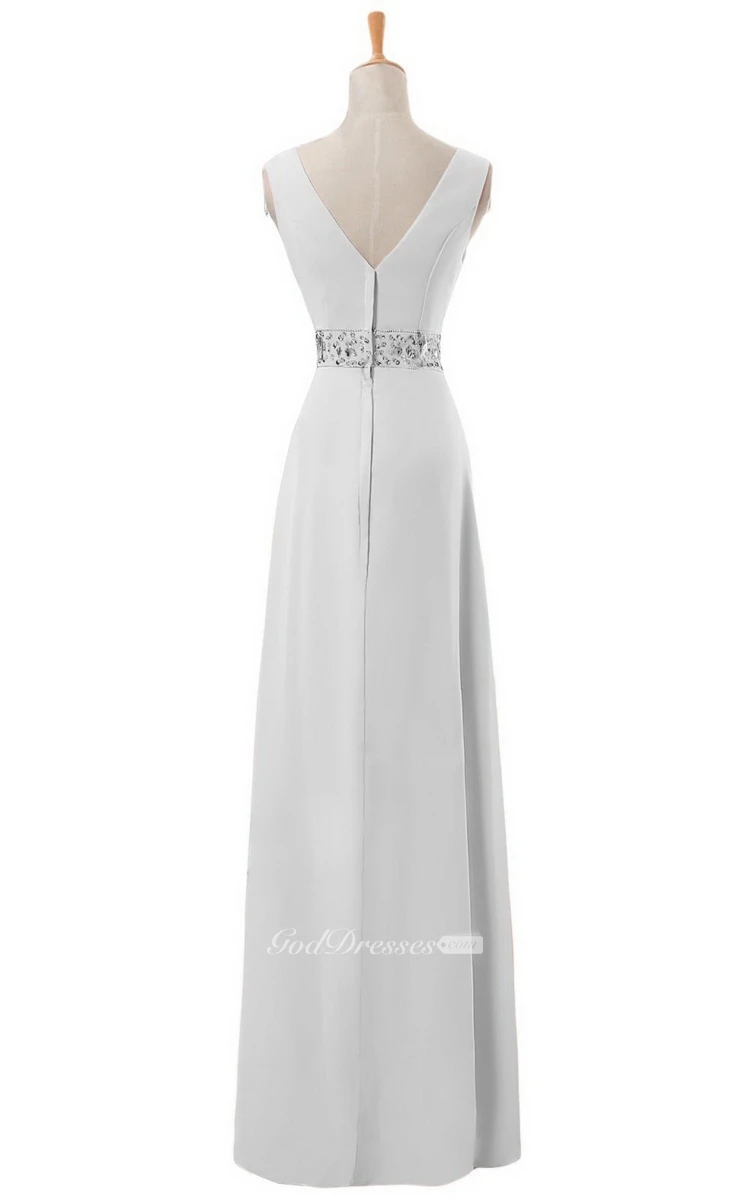 V-neck Long Empire Chiffon Dress With Rhinestones