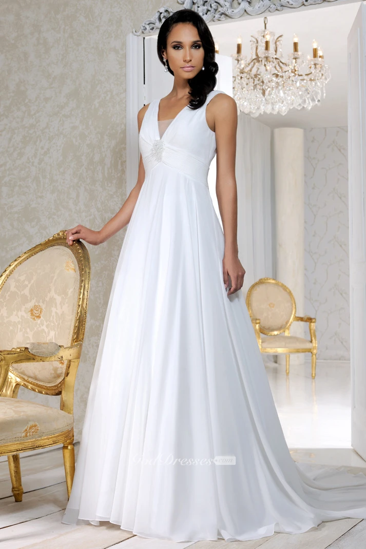 V-Neck Long Empire Pleated Chiffon Wedding Dress With Court Train And V Back