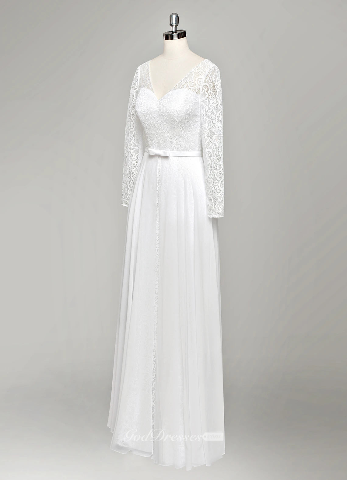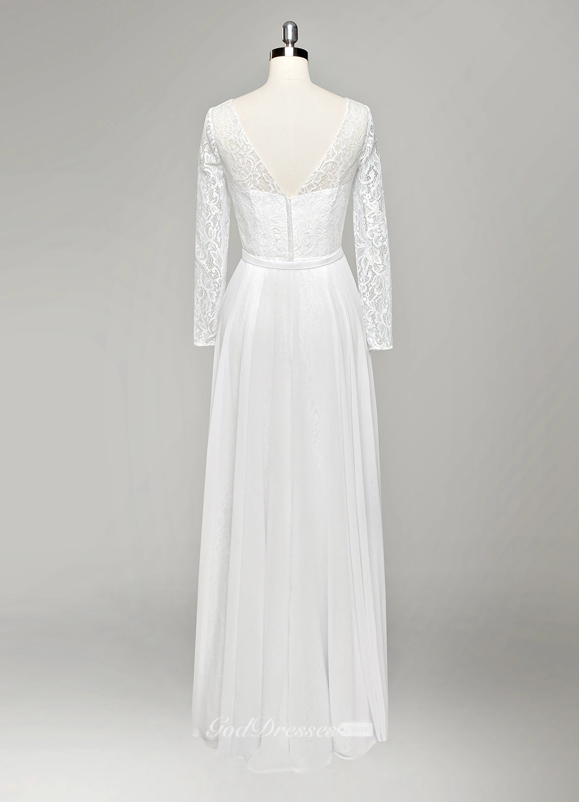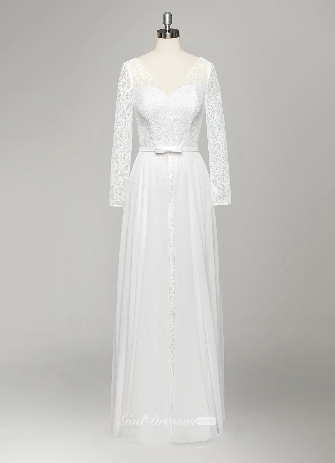 V-Neck Long Sleeve A-Line Lace and Chiffon Wedding Dress With Pleats