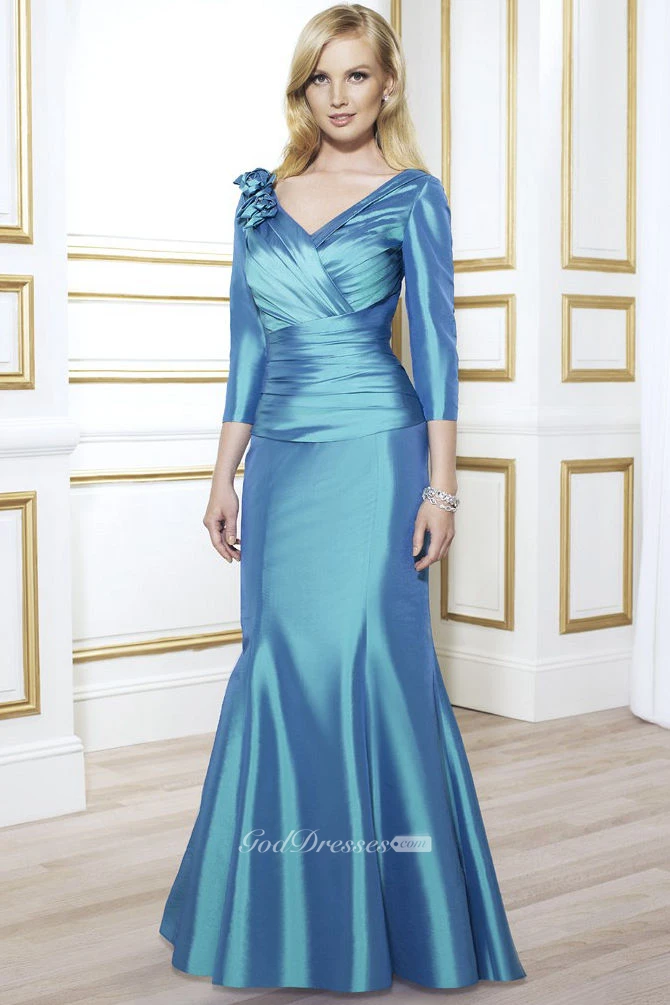 V-Neck Long Sleeve Floral Satin Mother Of The Bride Dress With Ruching
