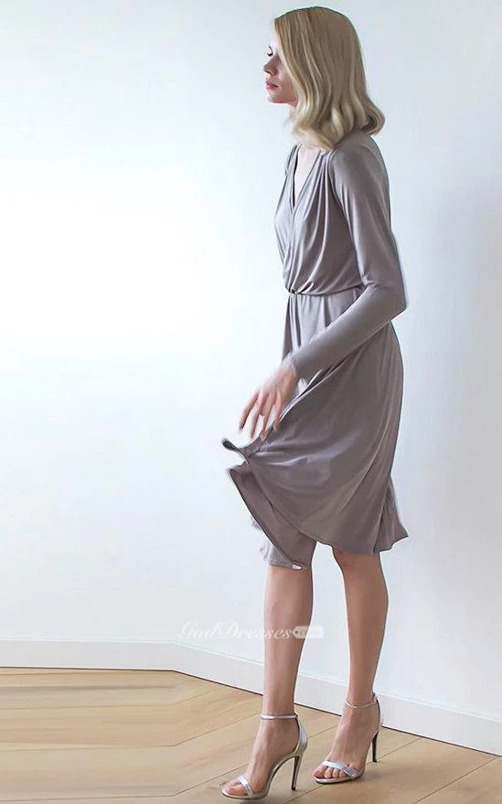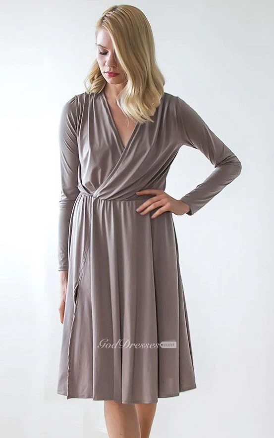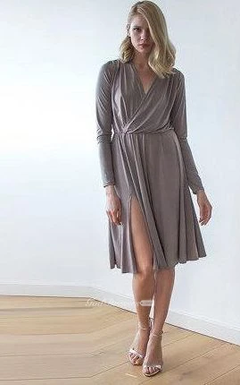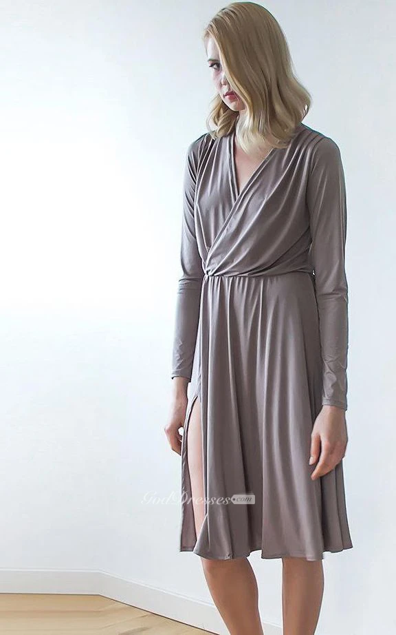 V Neck Long Sleeve Jersey Knee Length Dress With Side Split