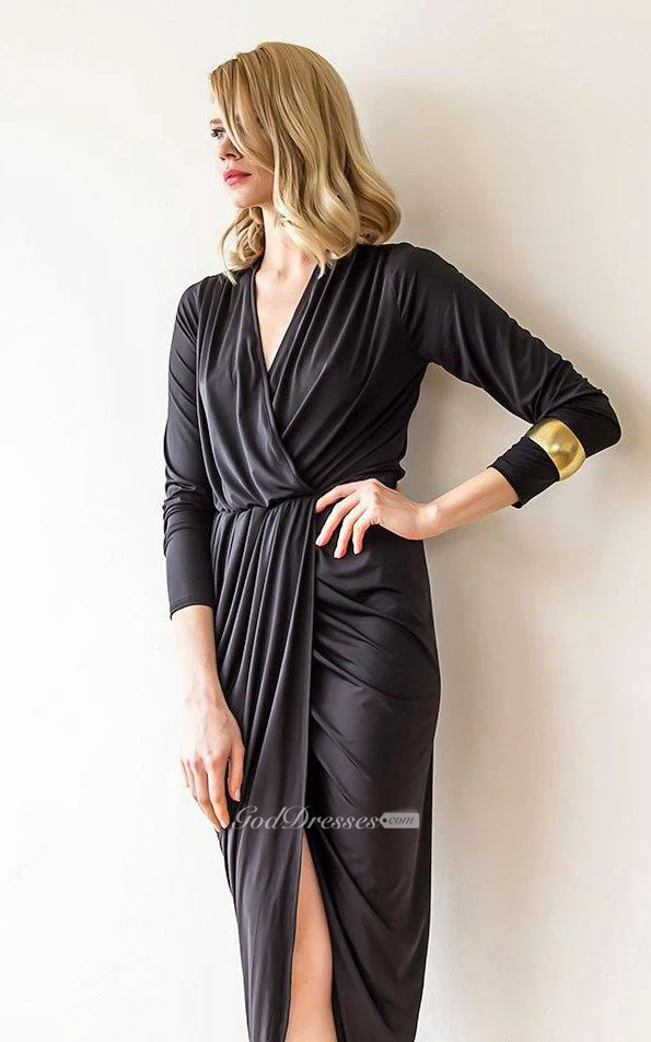 V Neck Long Sleeve Sheath Jersey Tea Length Dress With Front Split