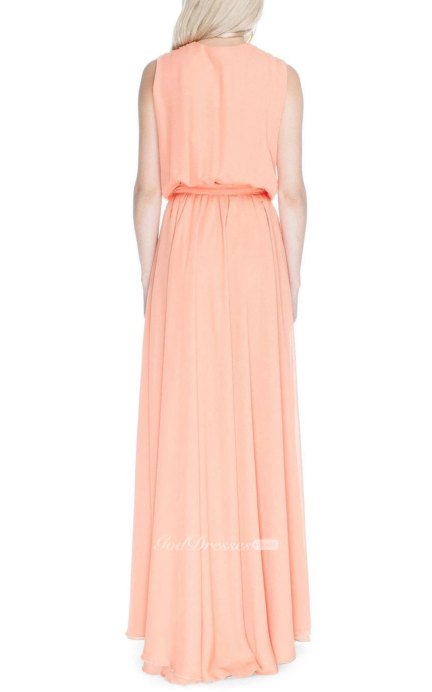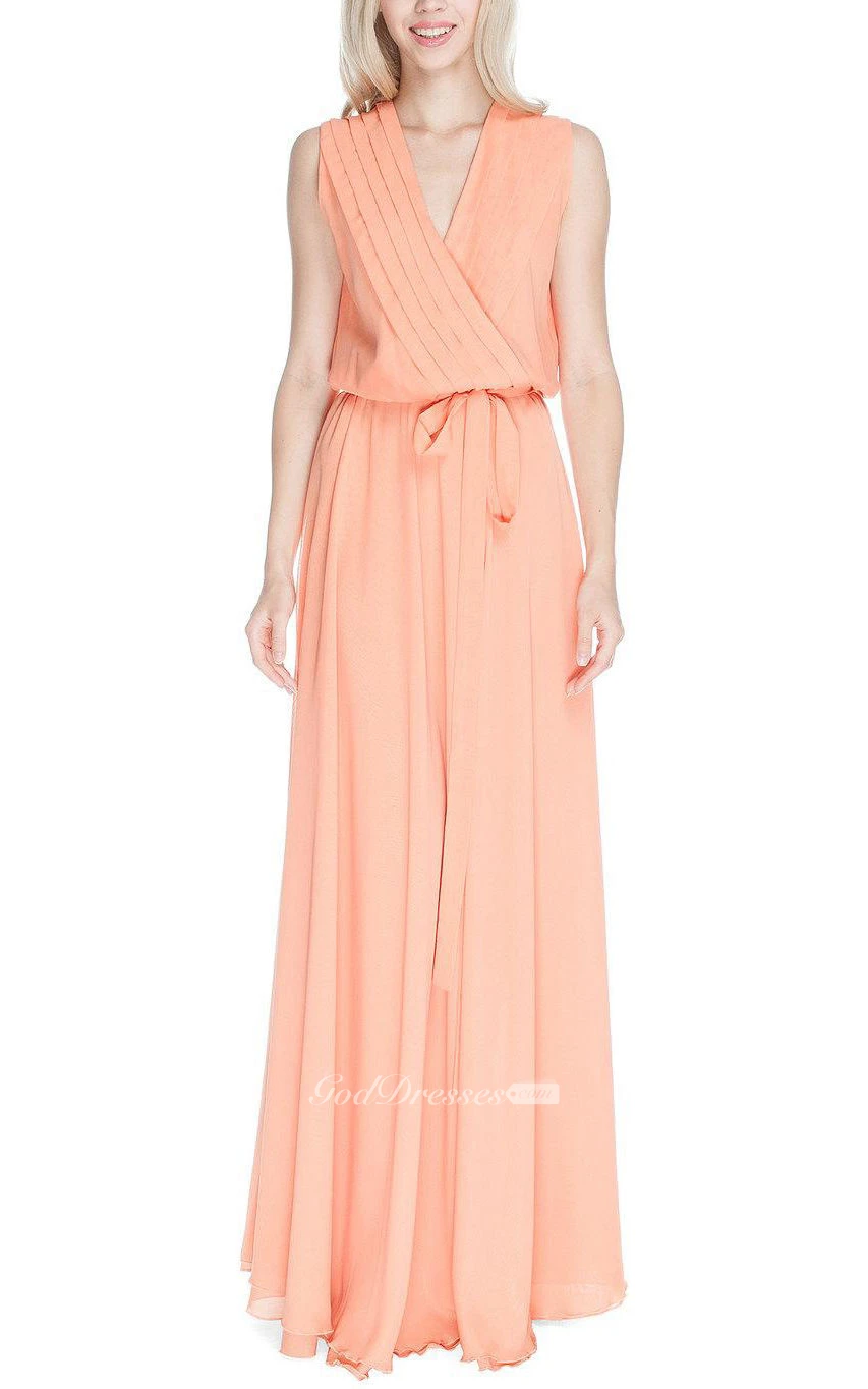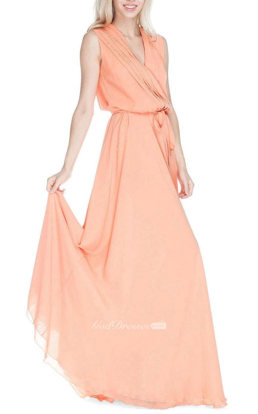 V Neck Pleated A-line Chiffon Floor Length Dress With Sash
