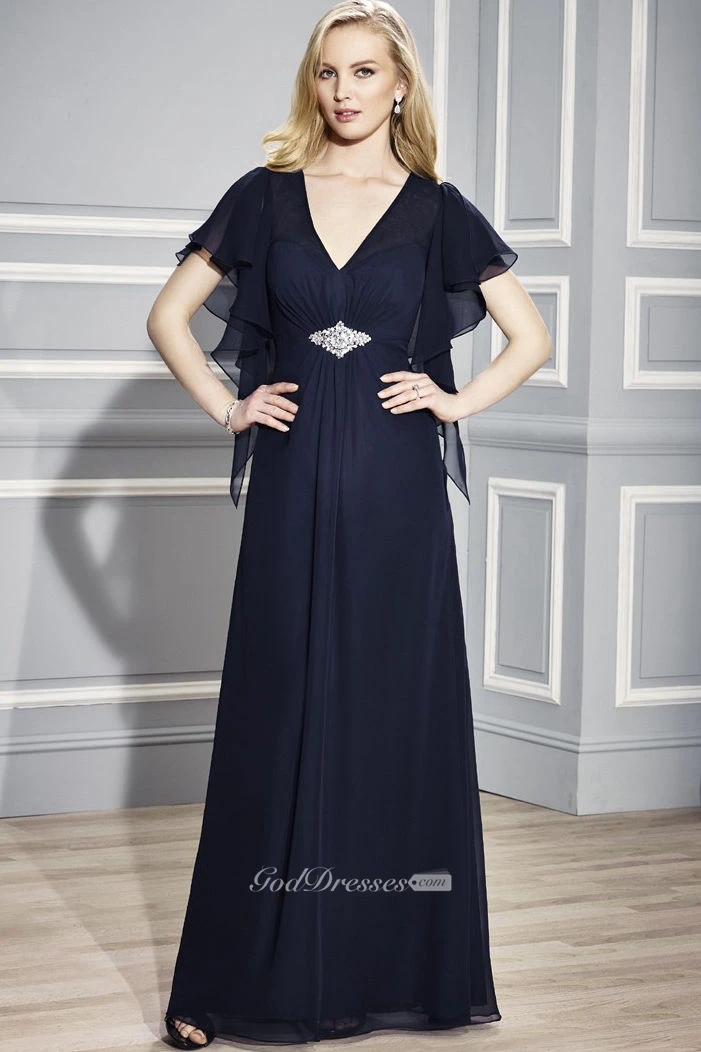 V-Neck Poet Sleeve Jeweled Chiffon Mother Of The Bride Dress With Draping