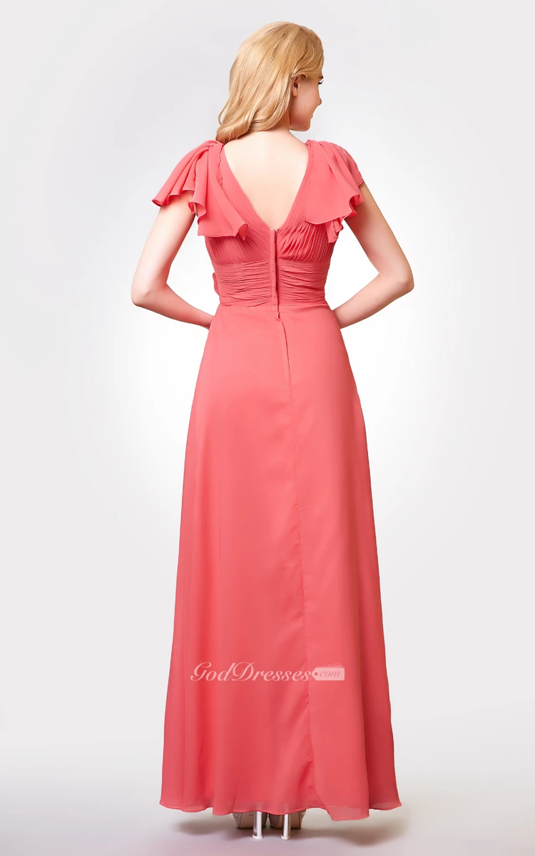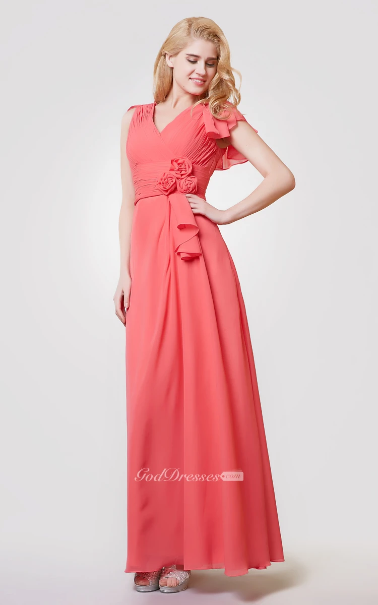 Your bridesmaids will look positively perfect in this gorgeous v-neck ruched a-line long chiffon dress with floral embellishments. A modern a-line silhouette flatters the form with a fitted bodice with a slimming v-neckline decked in delicate draping with ruffle cap sleeves. An elegant sash decked in beautiful floral rosettes cinches in the natural waistline for a figure flattering effect that would look great on any bridesmaid.