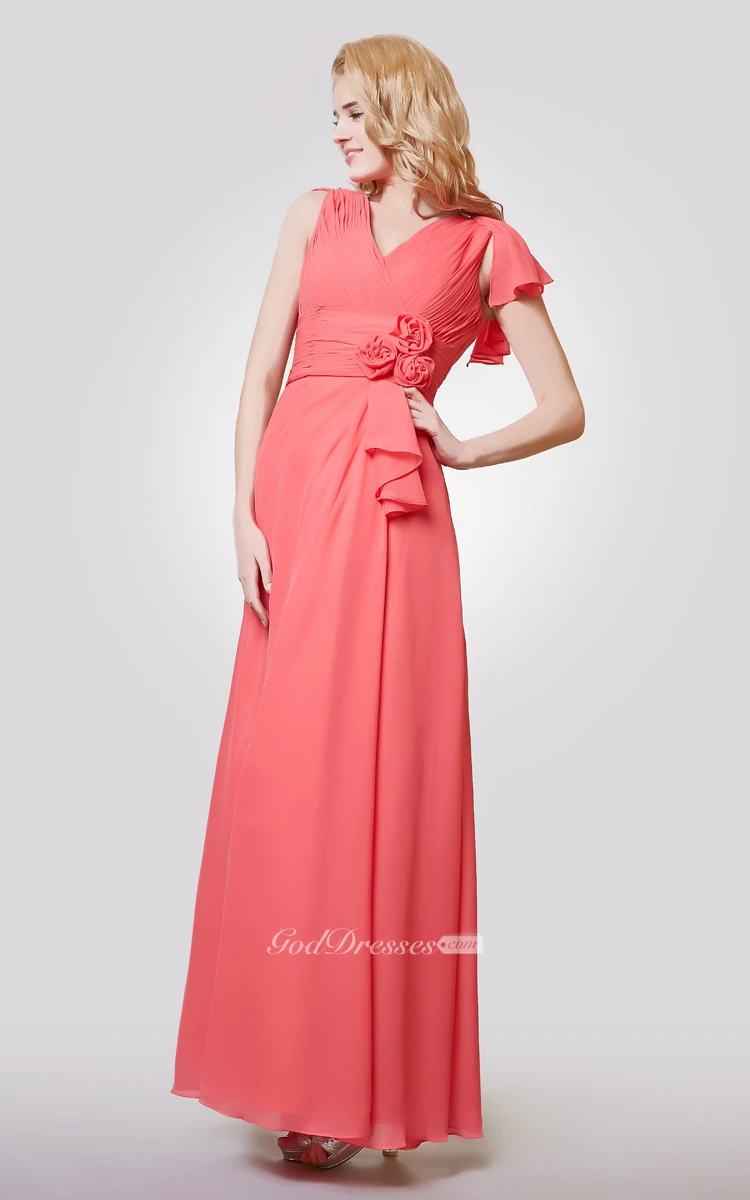 V-neck Ruched A-line Long Chiffon Dress With Flower
