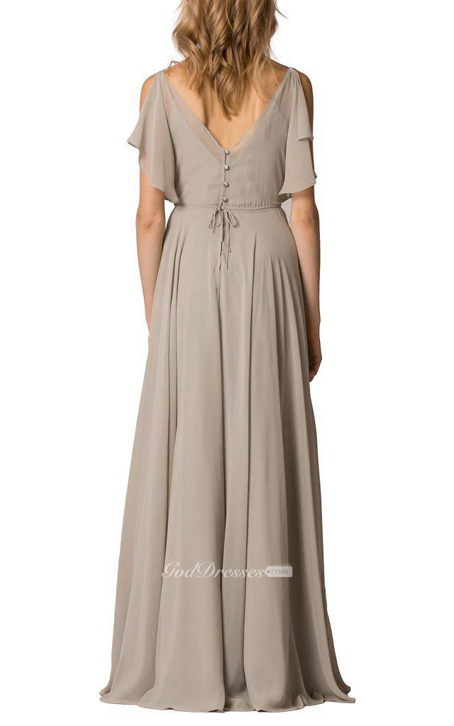 V-neck Ruched Floor-length Button Back Chiffon Dress