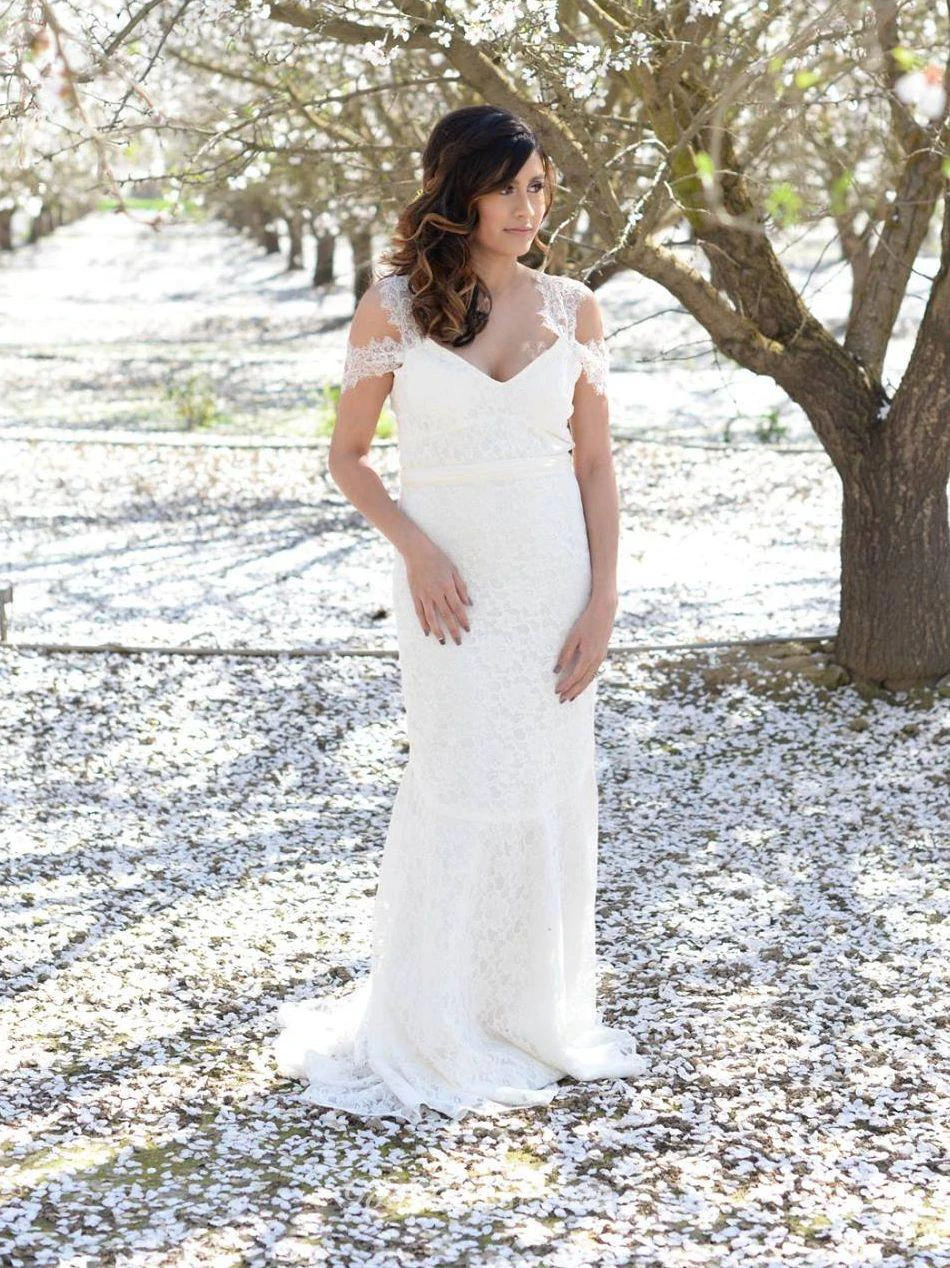 V-Neck Sheath Cap Sleeve Long Lace Dress With Sash