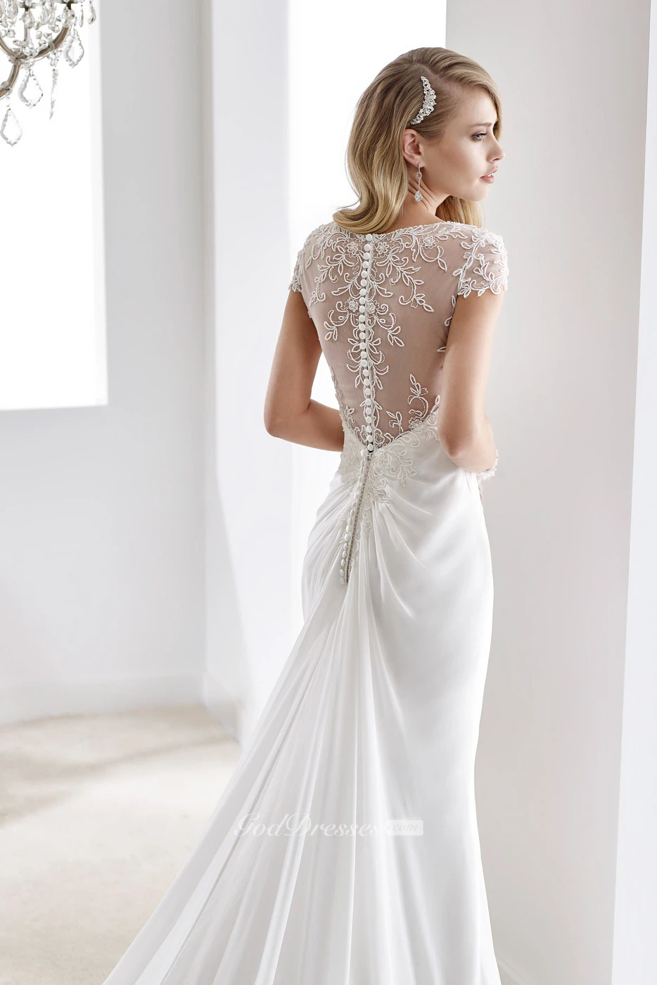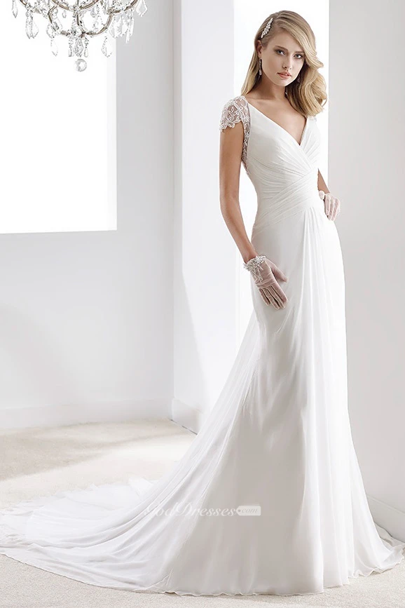V-Neck Sheath Chiffon Wedding Dress With Bandage Waist And Illusive Sleeves And Back