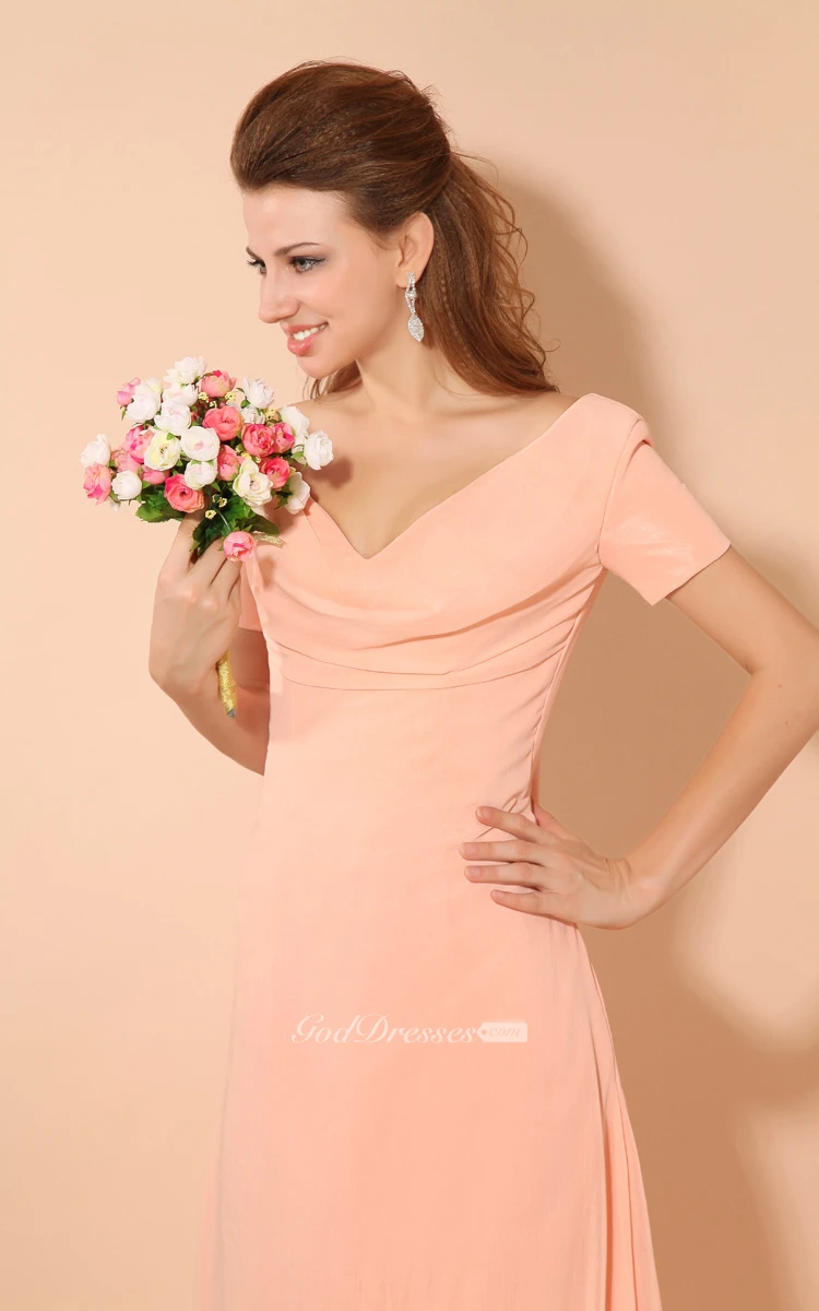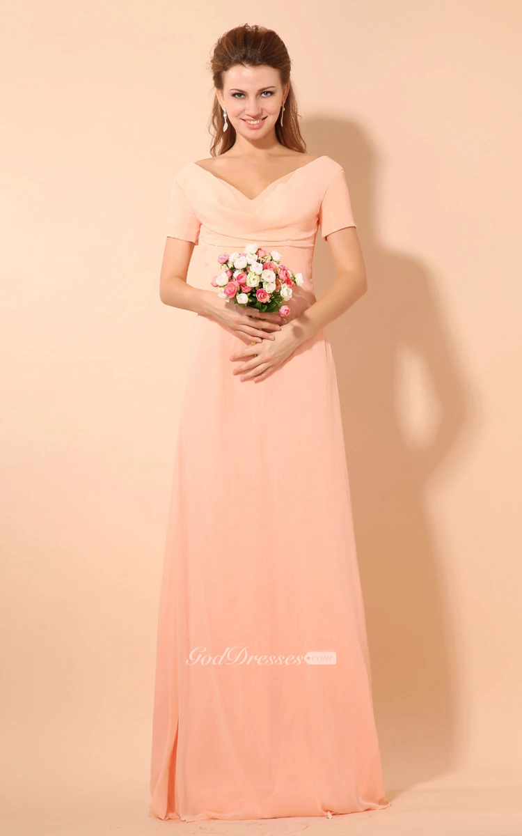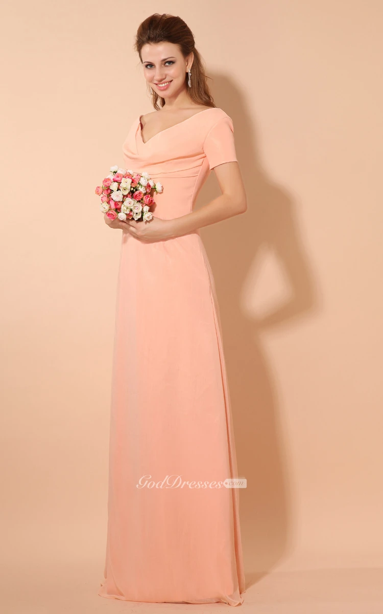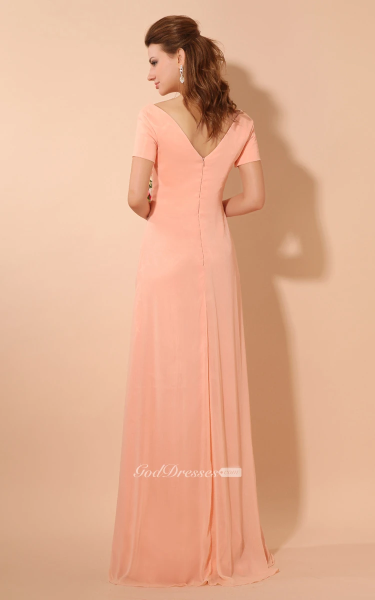 V-Neck Short-Sleeve Chiffon Floor-Length Dress With Ruching
