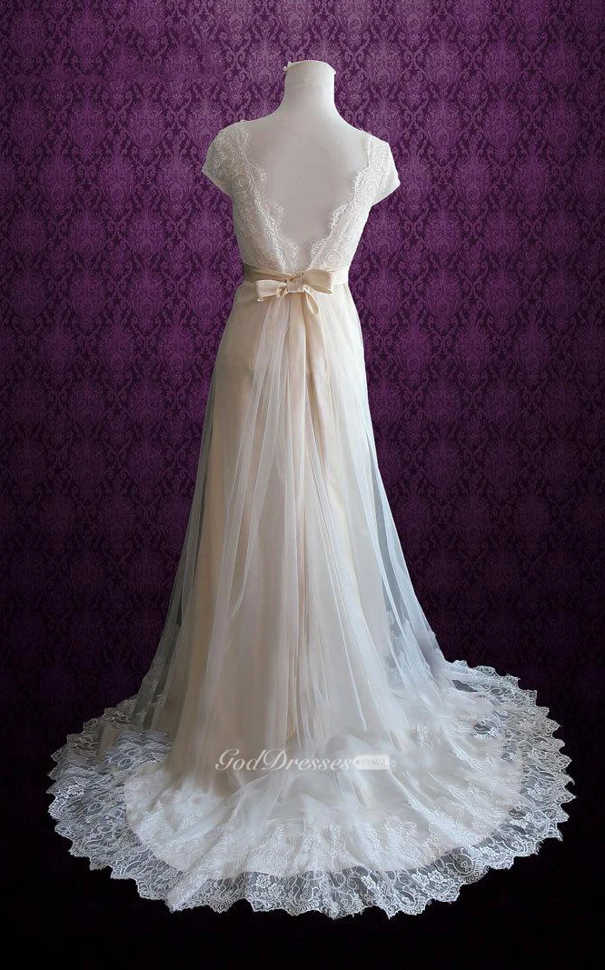 V-Neck Short Sleeve Lace And Tulle Dress With Sash And Bow