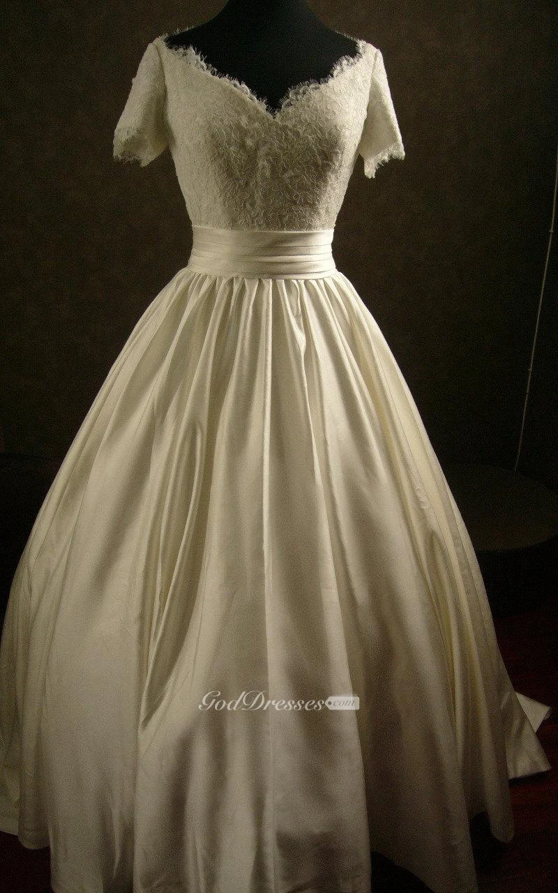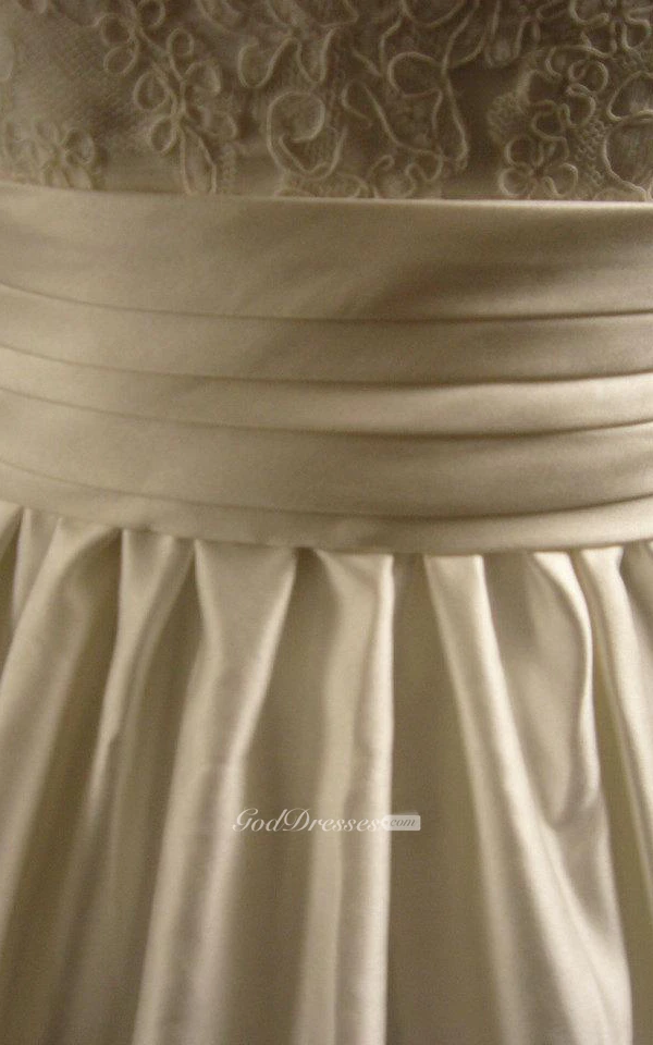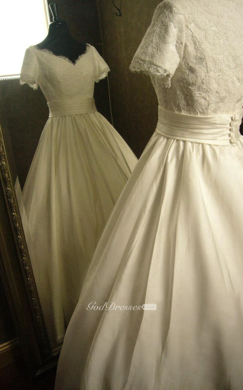 V-Neck Short Sleeve Pleated Satin Dress With Lace Bodice and Cinched Waistband