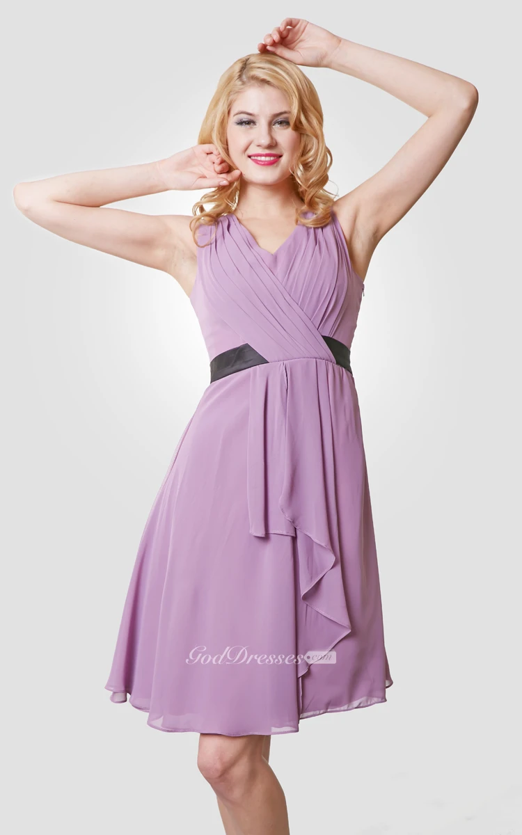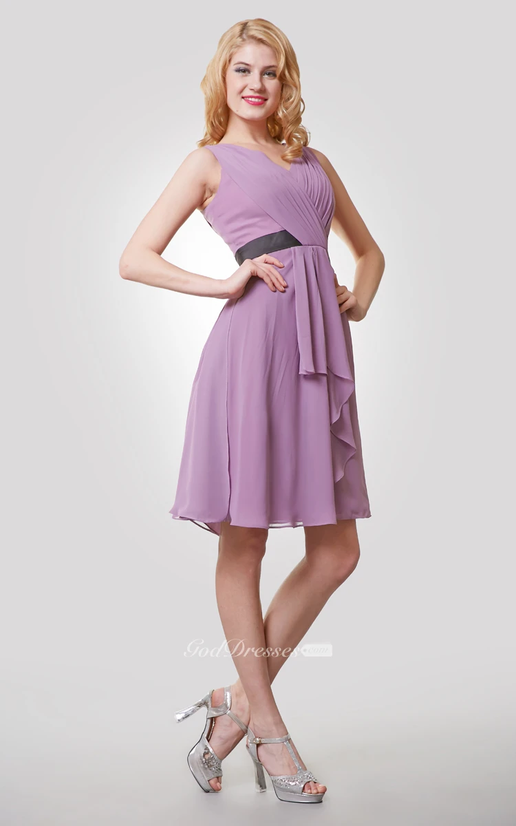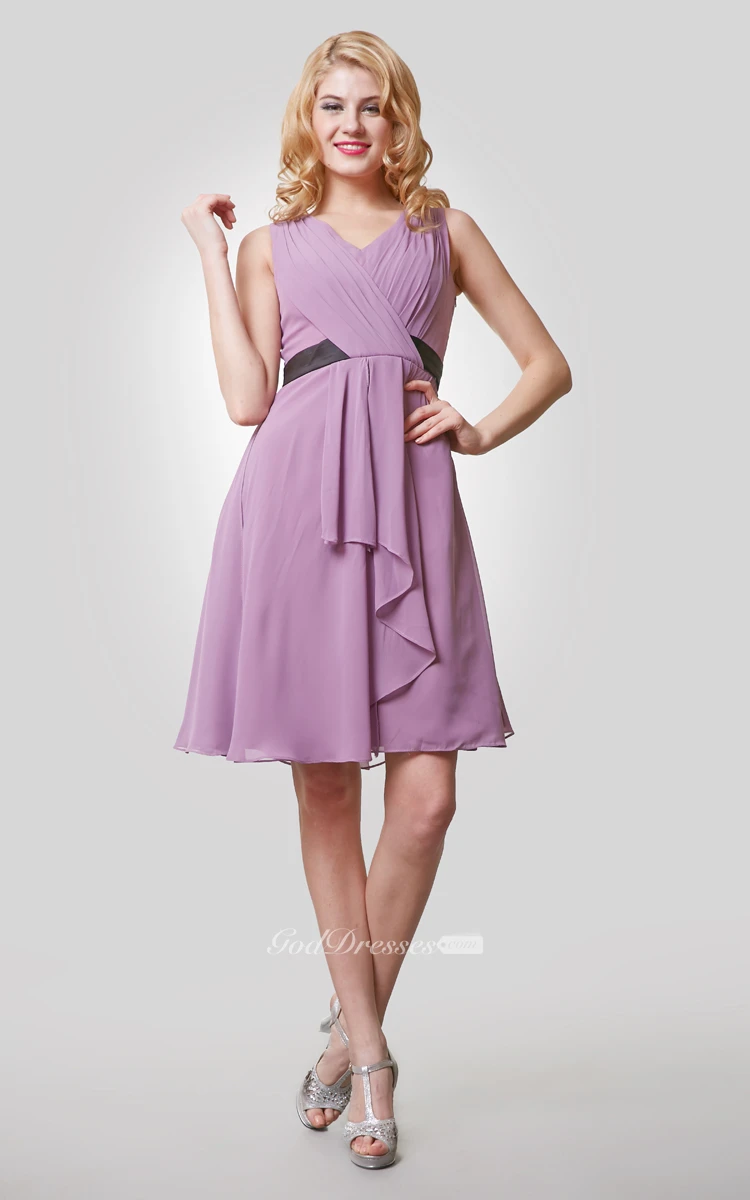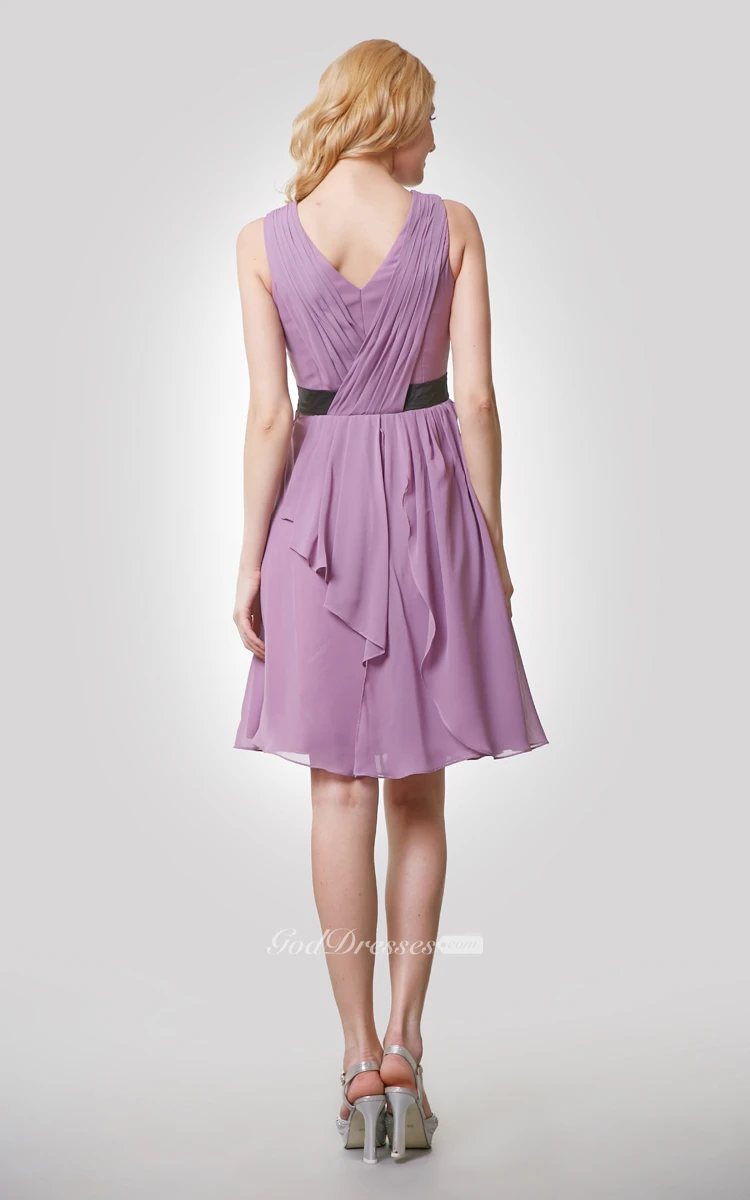 V-Neck Sleeveless Knee Length Chiffon Dress With Pleats and Draping