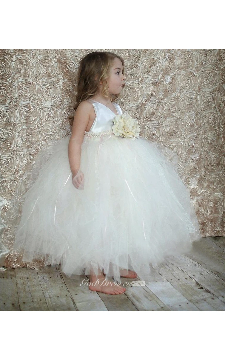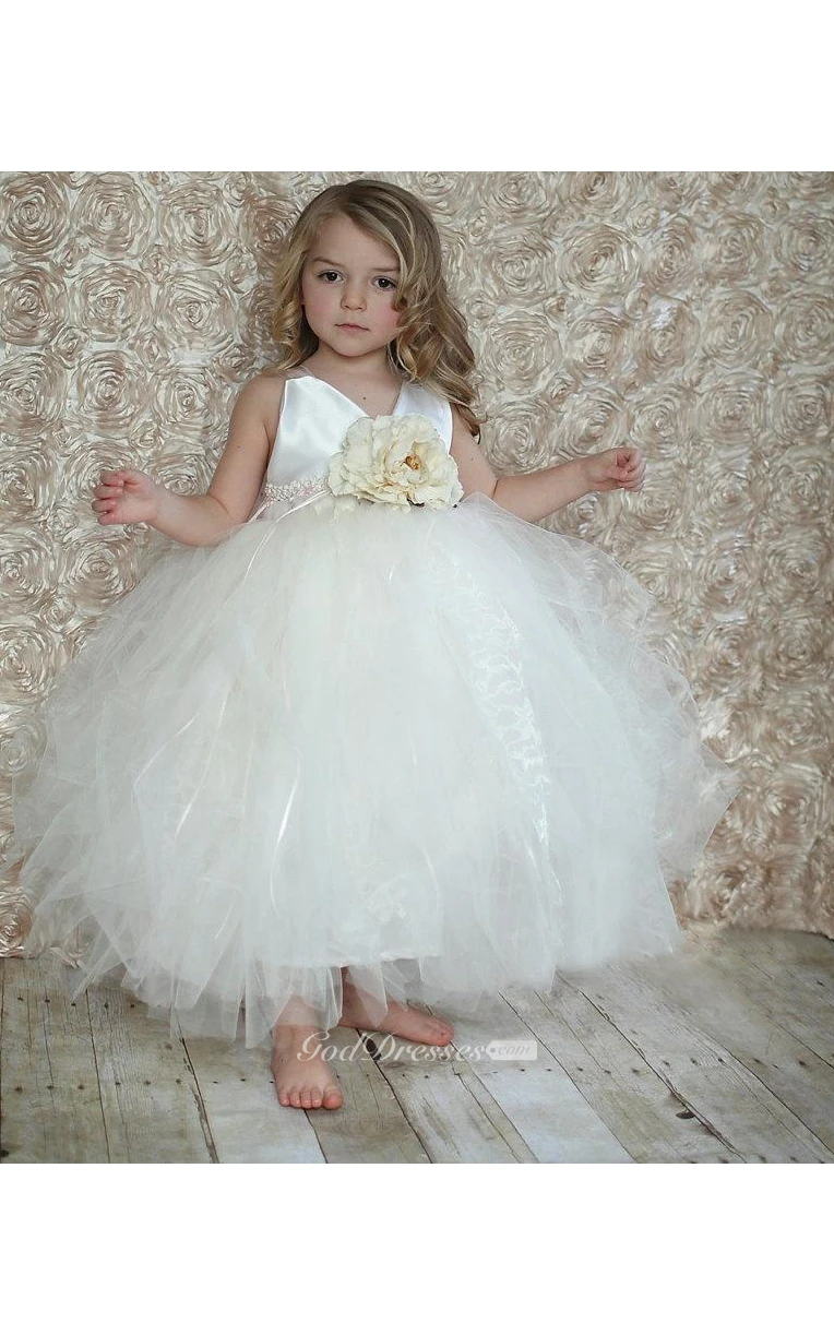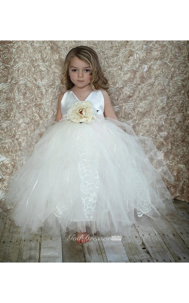 V Neck Tiered Tulle Ball Gown With Flower Sash