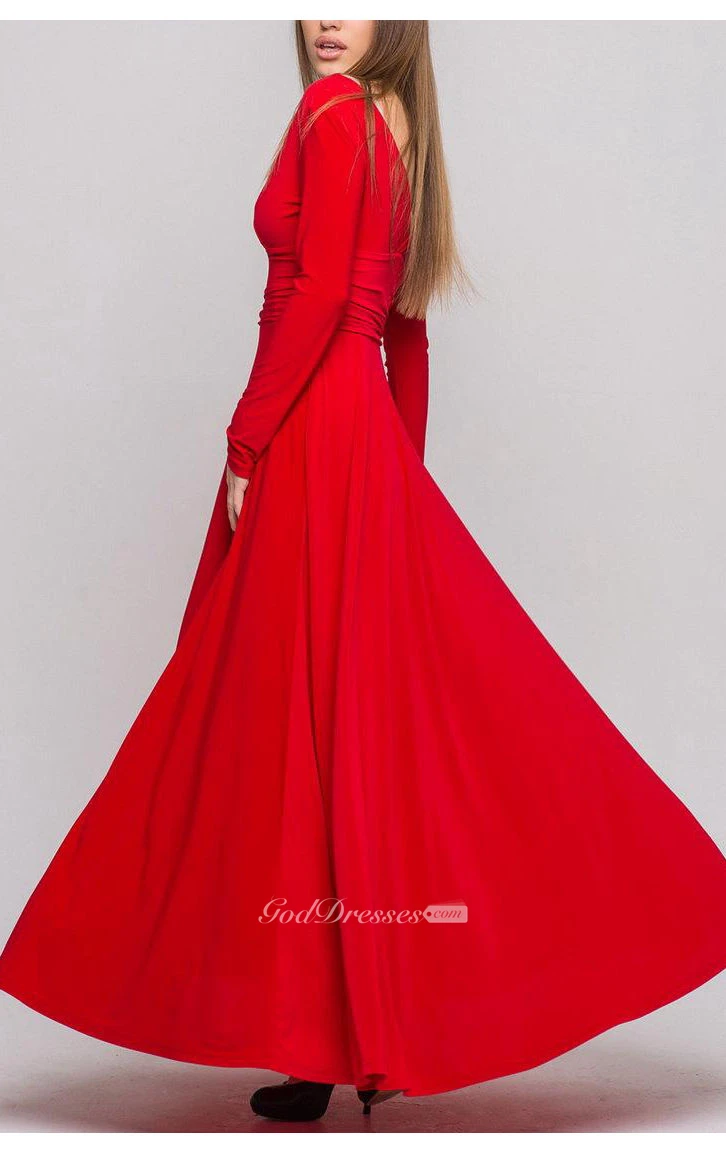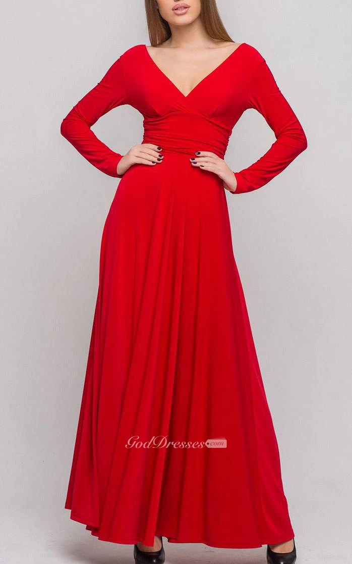 V Neck V Back Long Sleeve A-line Pleated Jersey Long Dress
