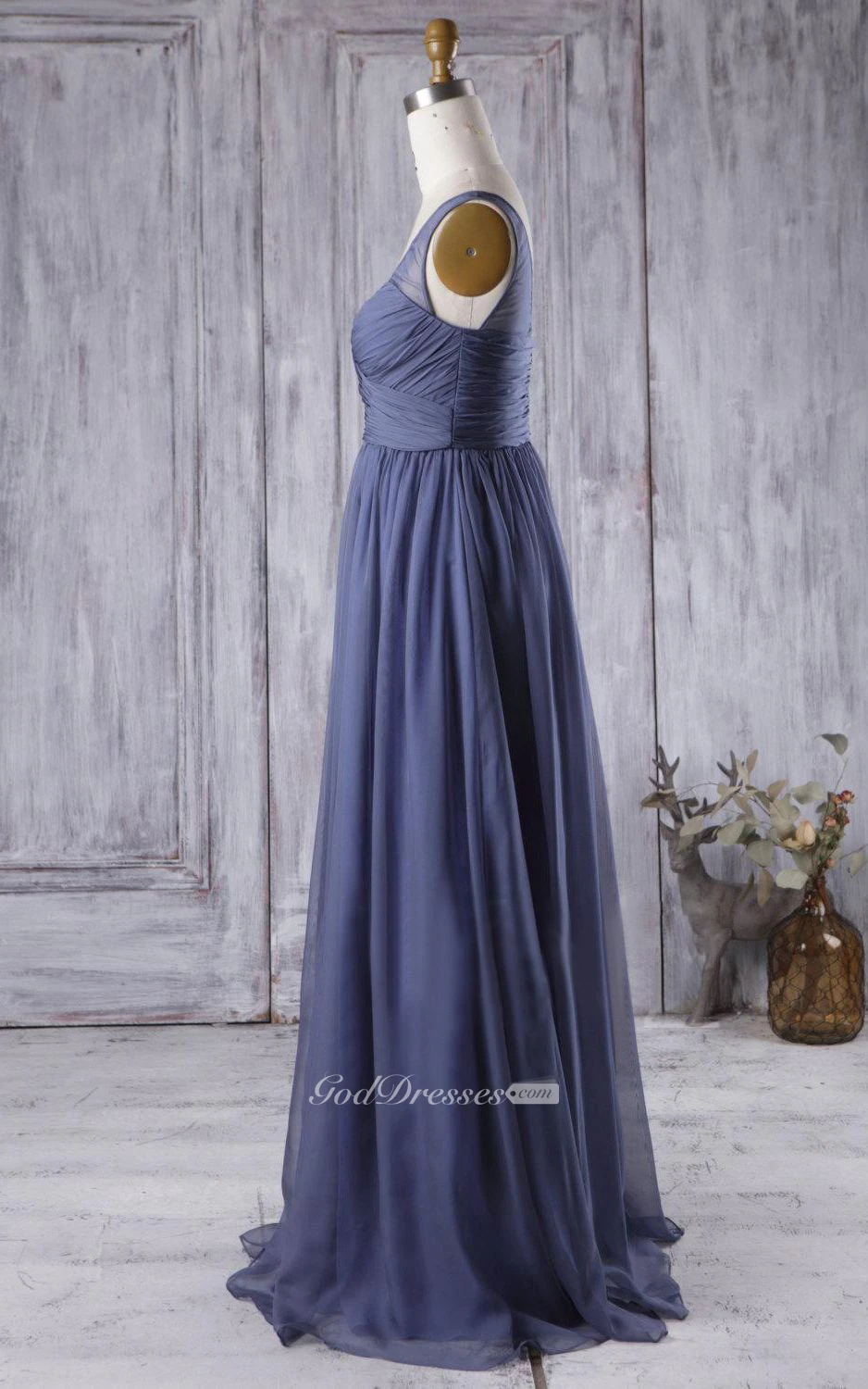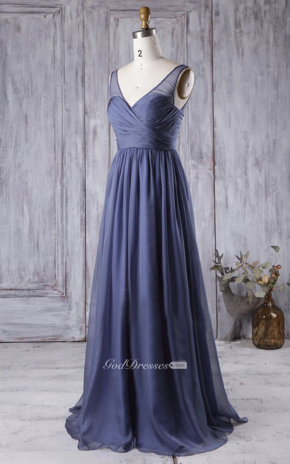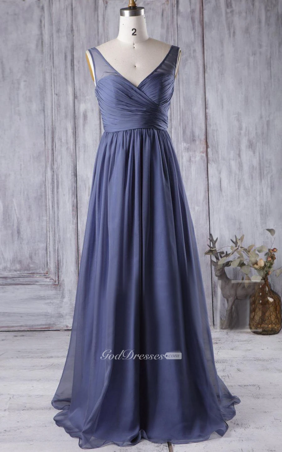 V Neck V Back Pleated A-line Chiffon Long Dress Brush Train