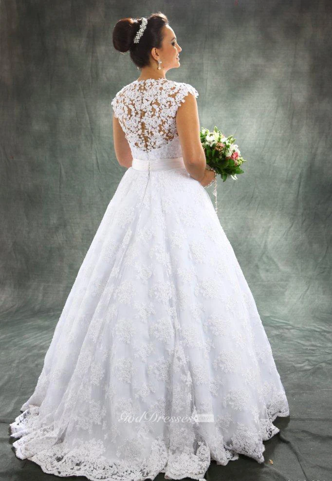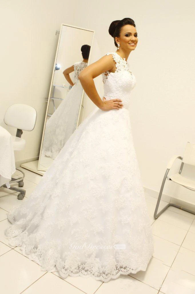 Vintage A Line Detachable Train Sheer Neck Bridal Gown
