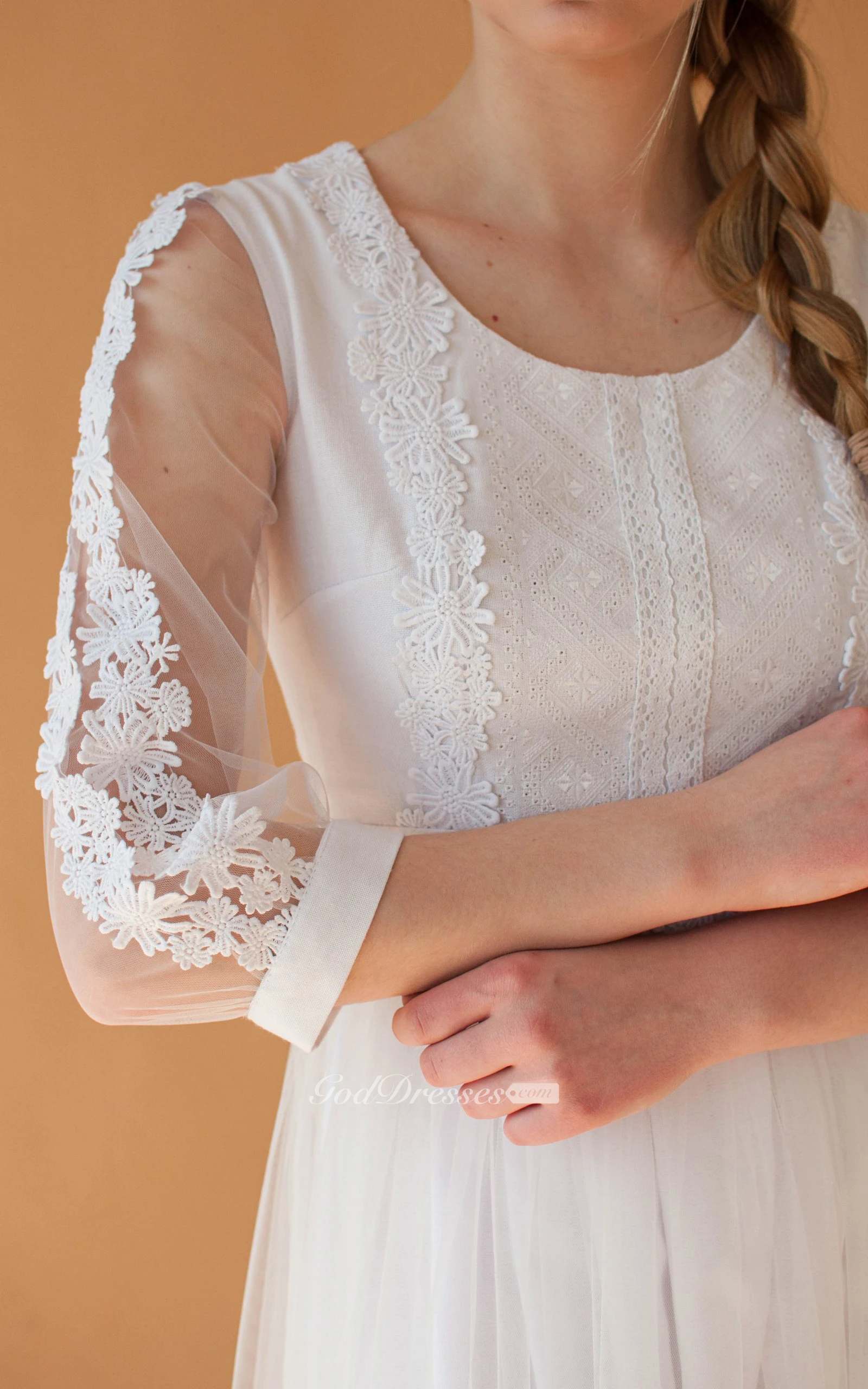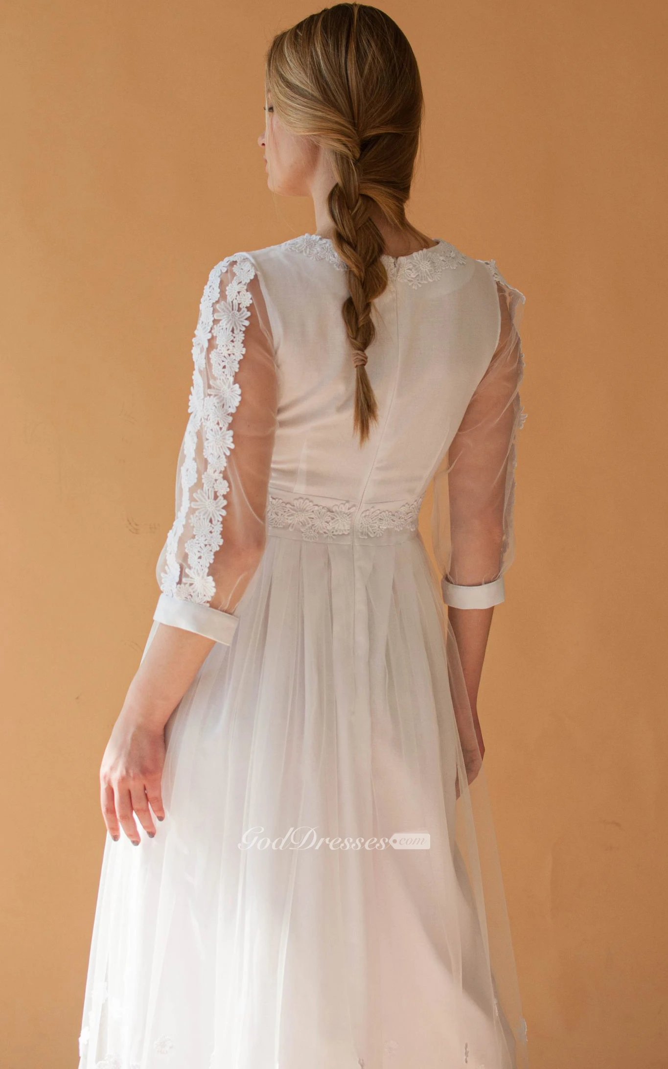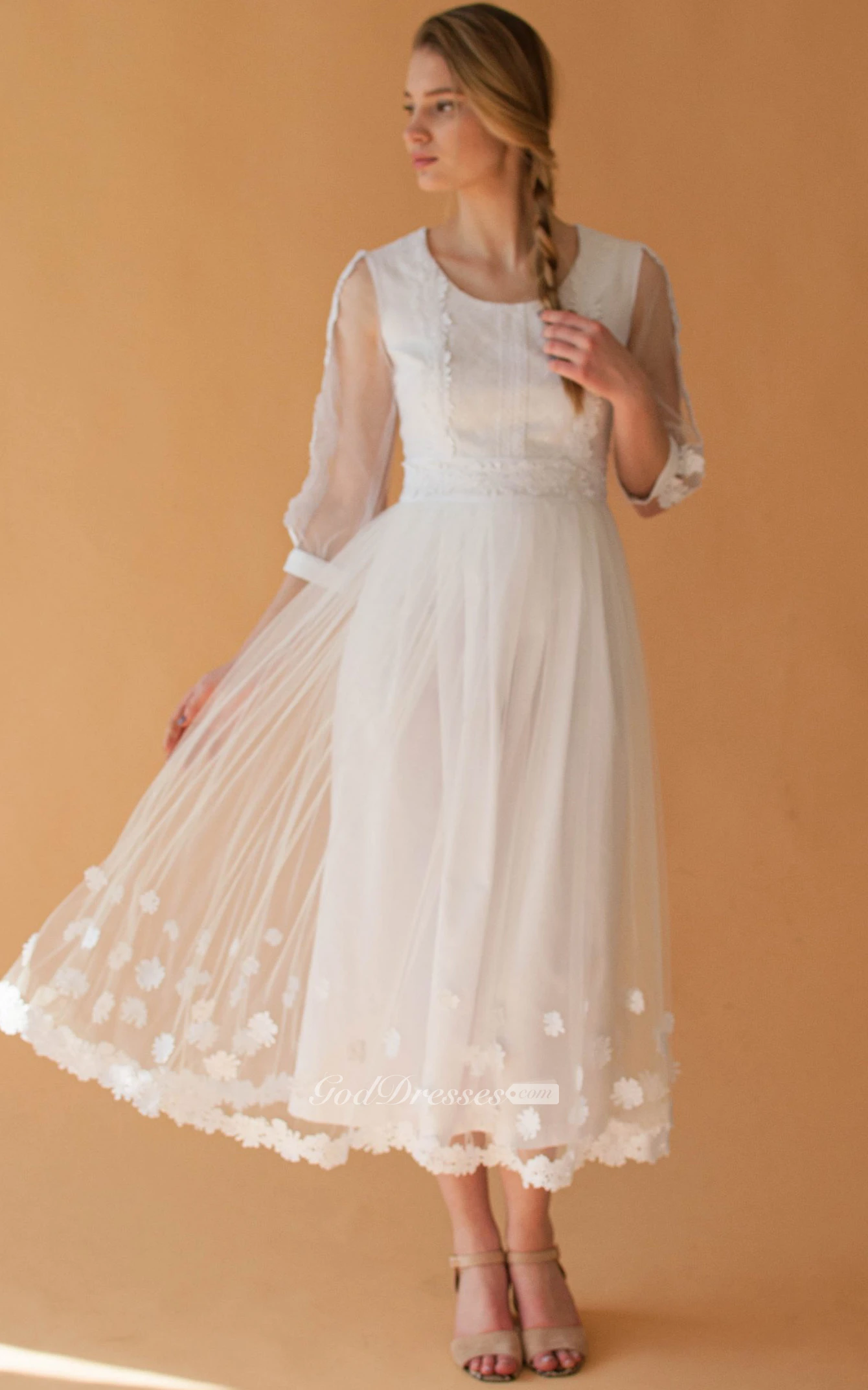 Vintage A Line Tulle Tea-length 3/4 Length Sleeve Zipper Wedding Dress with Appliques