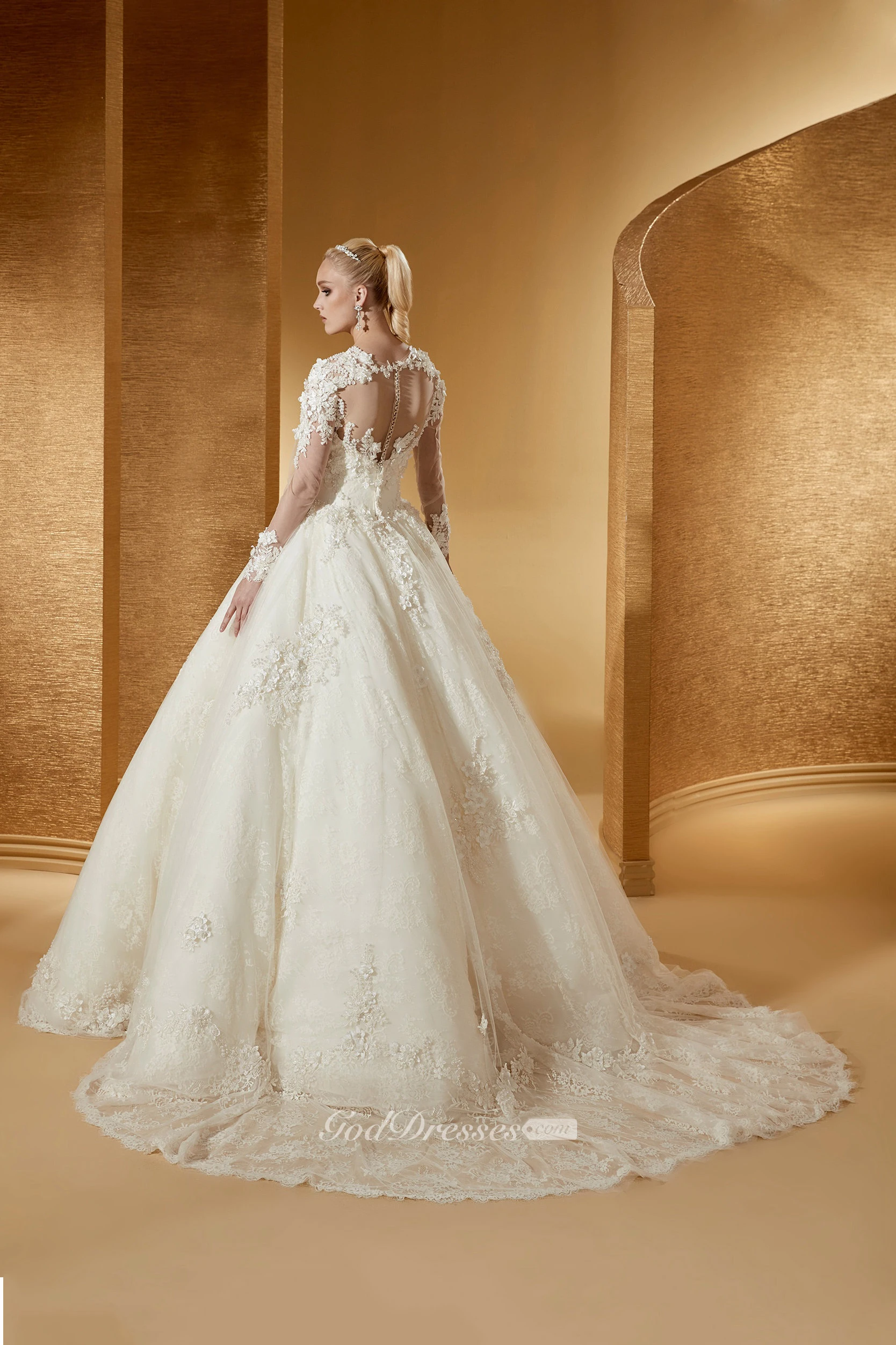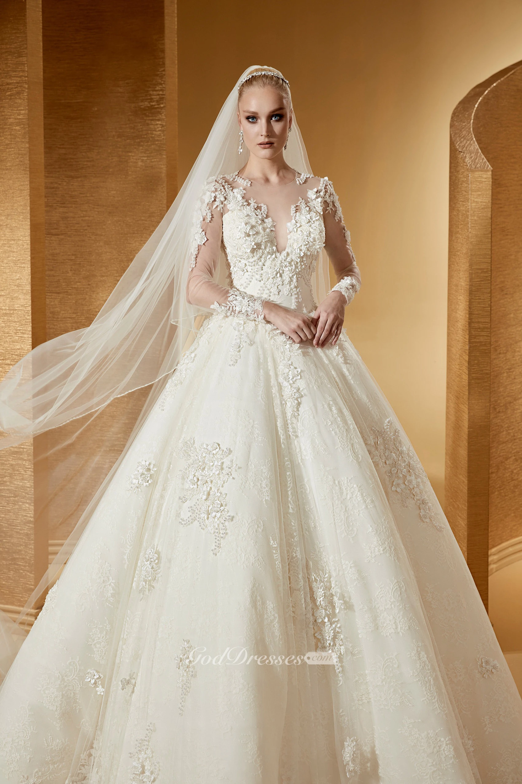 Vintage Long-Sleeve Ball Gown With Fine Appliques And Illusive Jewel Neck