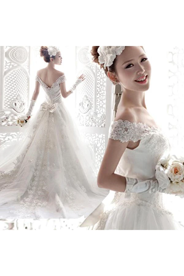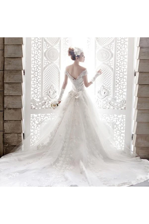 Vintage Off-the-Shoulder Lace Bowknot Wedding Dresses Lace With Long Train