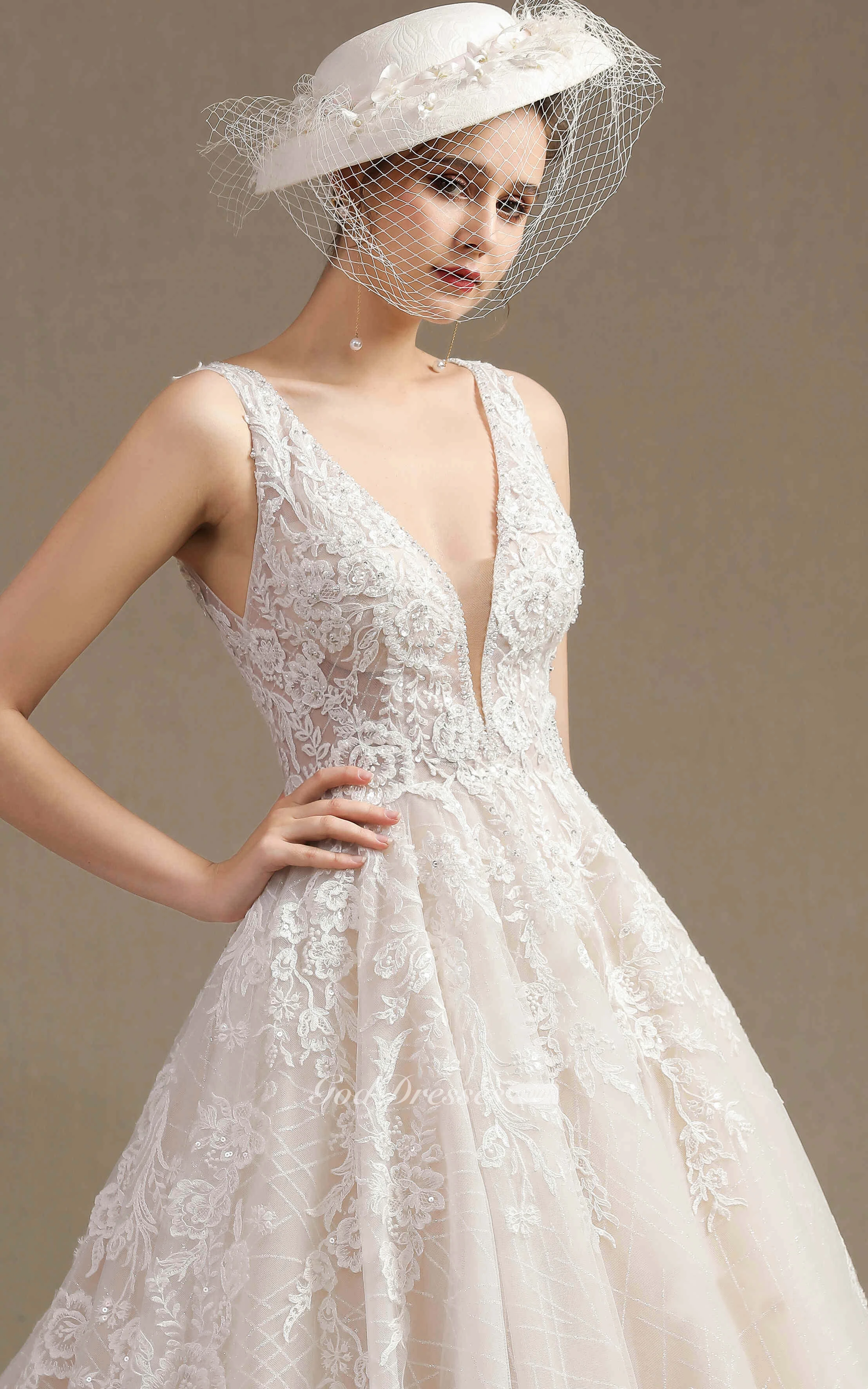 Vintage Plunging V-neck Keyhole Sleeveless Ballgown Wedding Dress With Lace Appliques And Ruching
