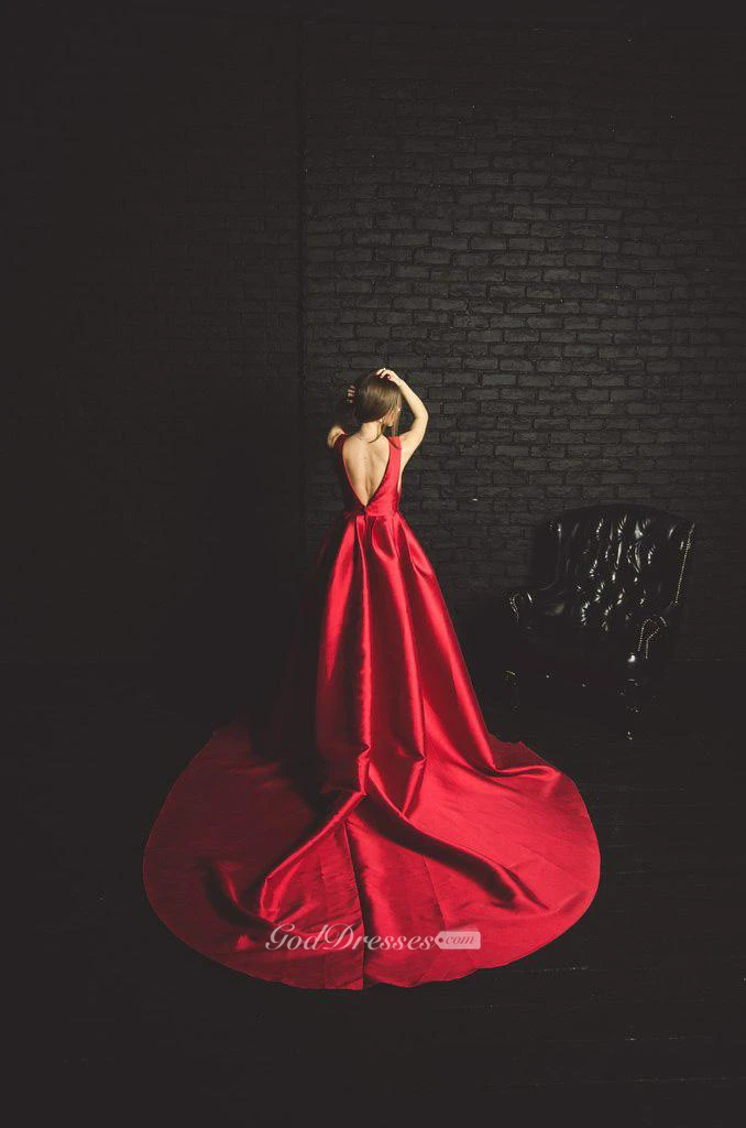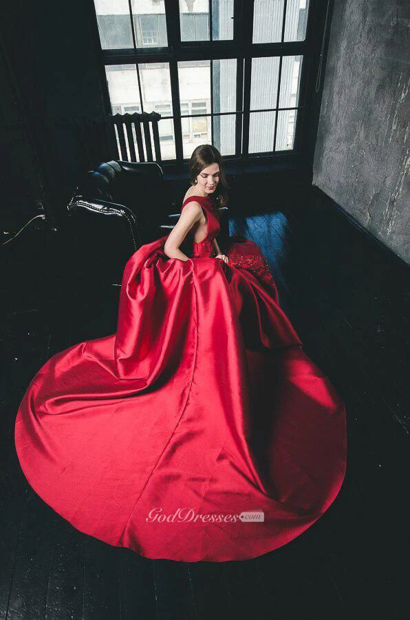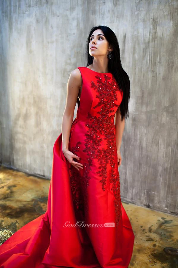 Vintage Red Sleeveless Appliques Evening Dress Long Train