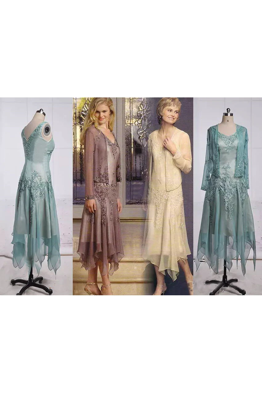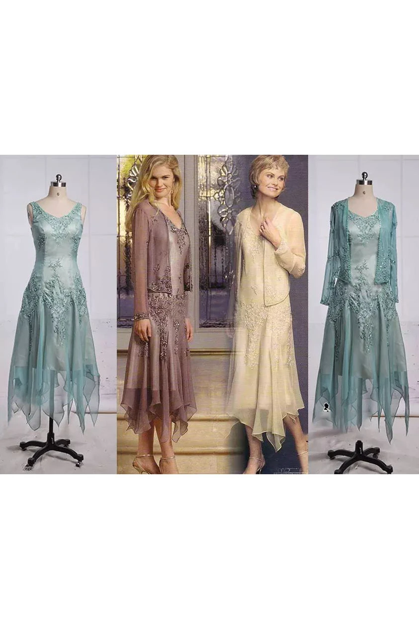 Vintage Two Piece Women Low-V Back V-neck Satin Tulle Appliques Dress With Jacket