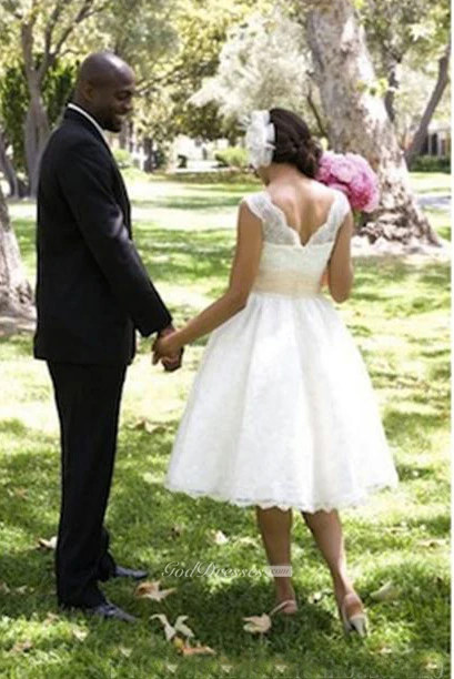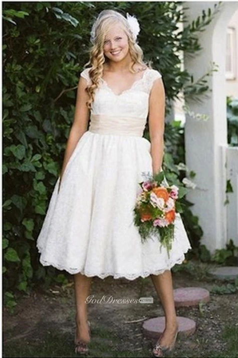 Vintage V Neck Cap Sleeves Appliques Puffy Tulle Tea Length Wedding Gown