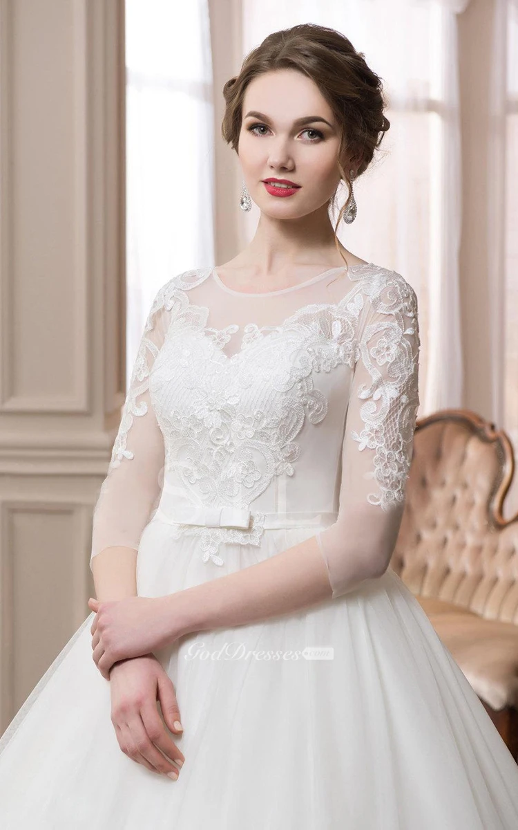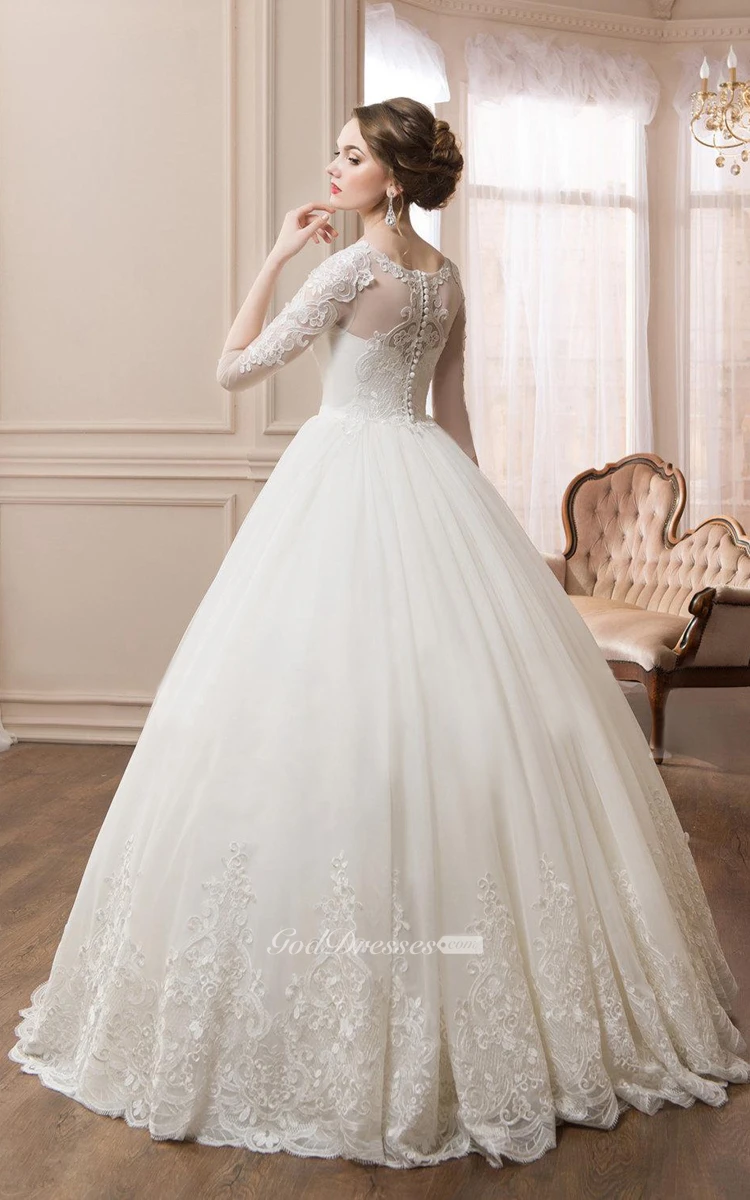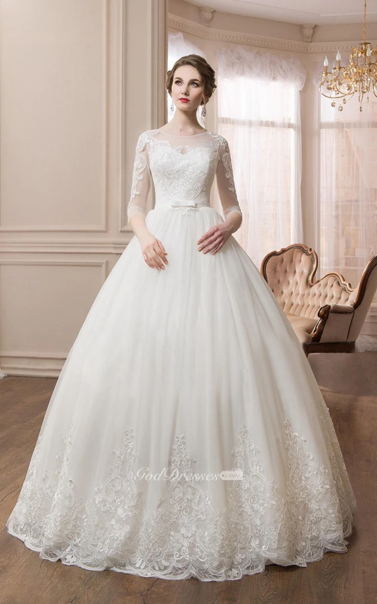Scoop Long Sleeve Ball Gown Dress With Illusion Sleeves