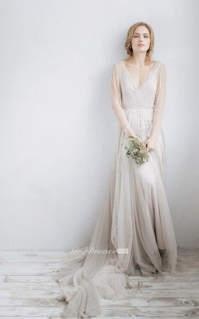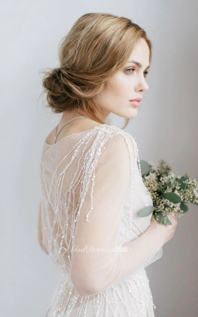 Long Sleeve V-Neck Illusion Tulle Weddig Dress With Beading