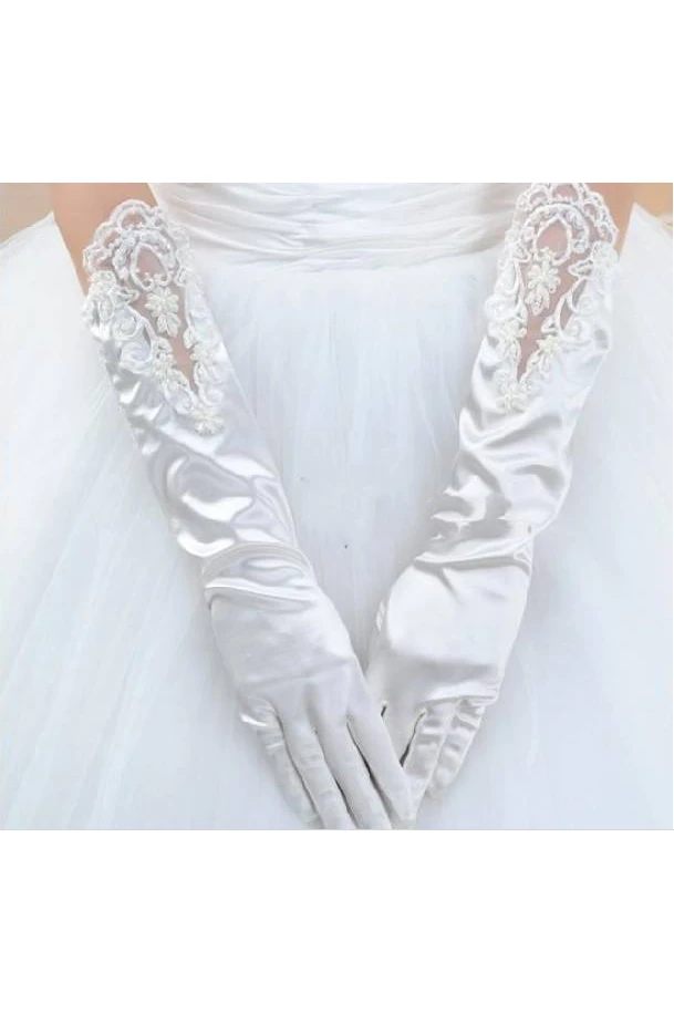 White Stretch Satin Long Length Sequins Beads Package Refers To Gloves