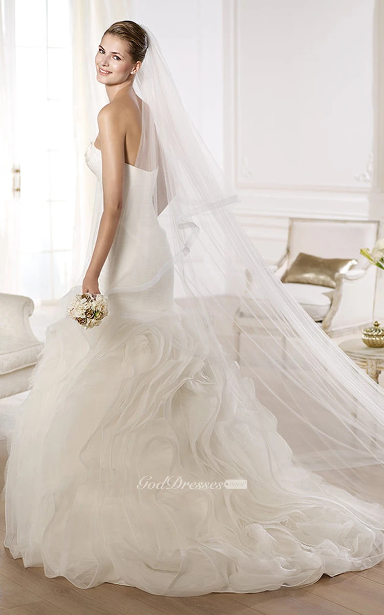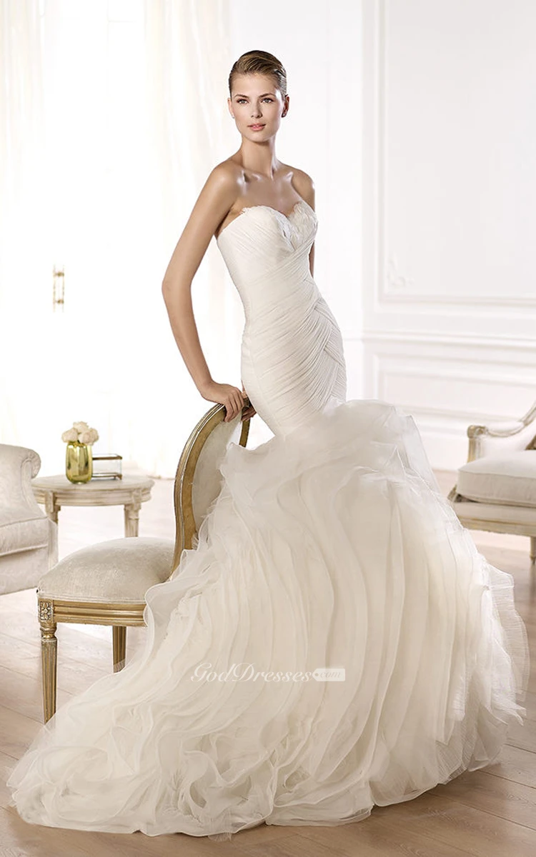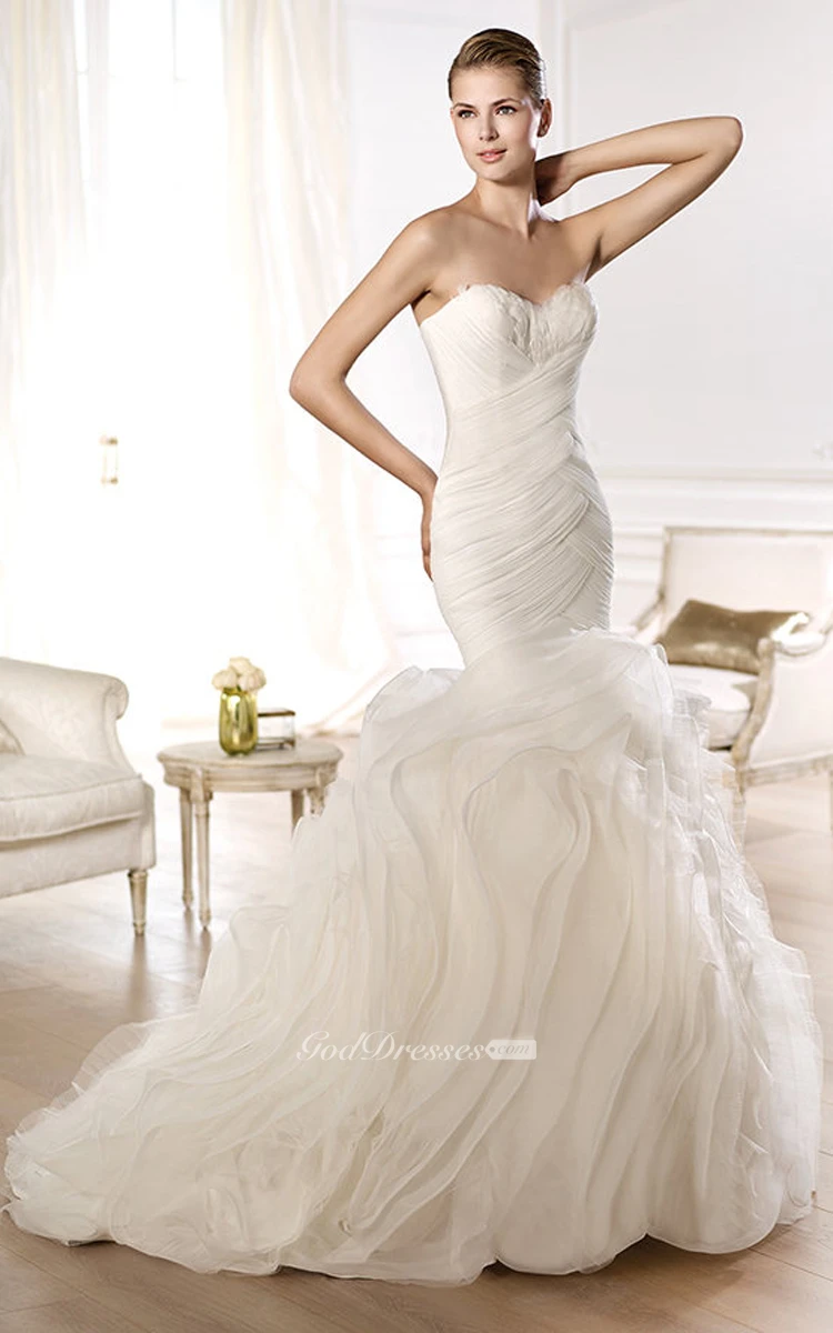 Strikingly sophisticated with an artful design, this strapless gown exposes the arms, shoulders, and chest. The sweetheart neckline accentuates the bust above a formfitting, mermaid silhouette that crisscrosses the curves of the figure with diagonal ruches before the skirt flares.